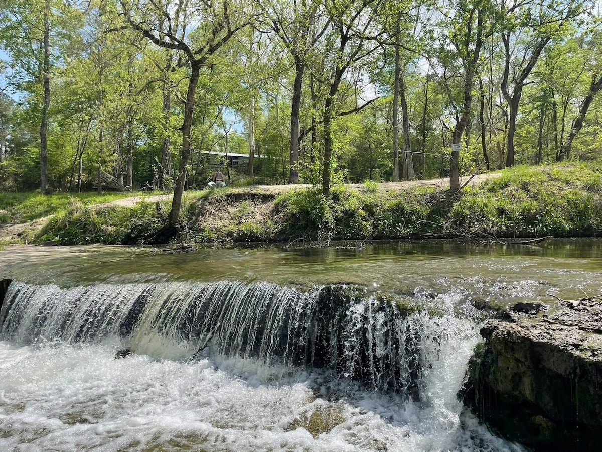 Built 2018, inside bathroom remodeled 2023. Studio cabin. King bed, adult twin bunk beds, large leather sofa, big covered deck, swing, grilling, soaking. Beautiful spot relaxing, soakin, float or exploring Surrounded by trees/deers. Hiking trails We have Collier & Caddo Cabins. Prettiest creek! Gurgling/cool crystal clear No dog fee! Hardwood floors, free long-distance, Patio overlooking creek! WiFi & directtv. Trees, deers & bonus fully plumbed Out house! Please stay on our property & creek!