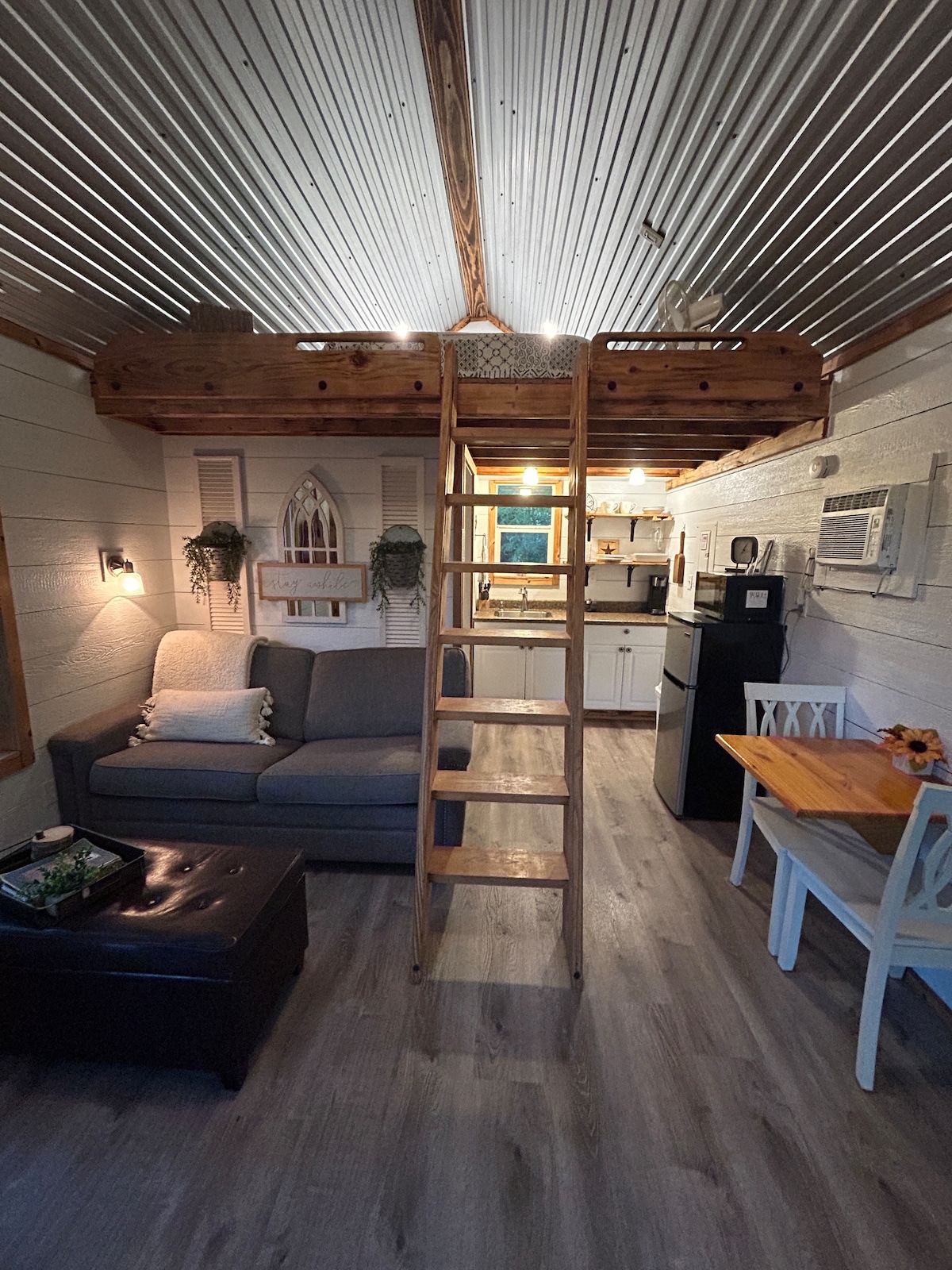 This tiny cottage is nestled behind an old farm house on a 100 acre working farm just 25 mins south of Downtown Dallas. The 200 square foot space features a detached / shared bathroom connected by the front porch with beautiful stock tank soaker tub. Inside there is a bunk-room complete with full and twin size beds, a cozy loft with a queen mattress, and quaint living room with futon, electric kettle, microwave, and mini fridge. If you need a place to escape the hustle and bustle this is it!