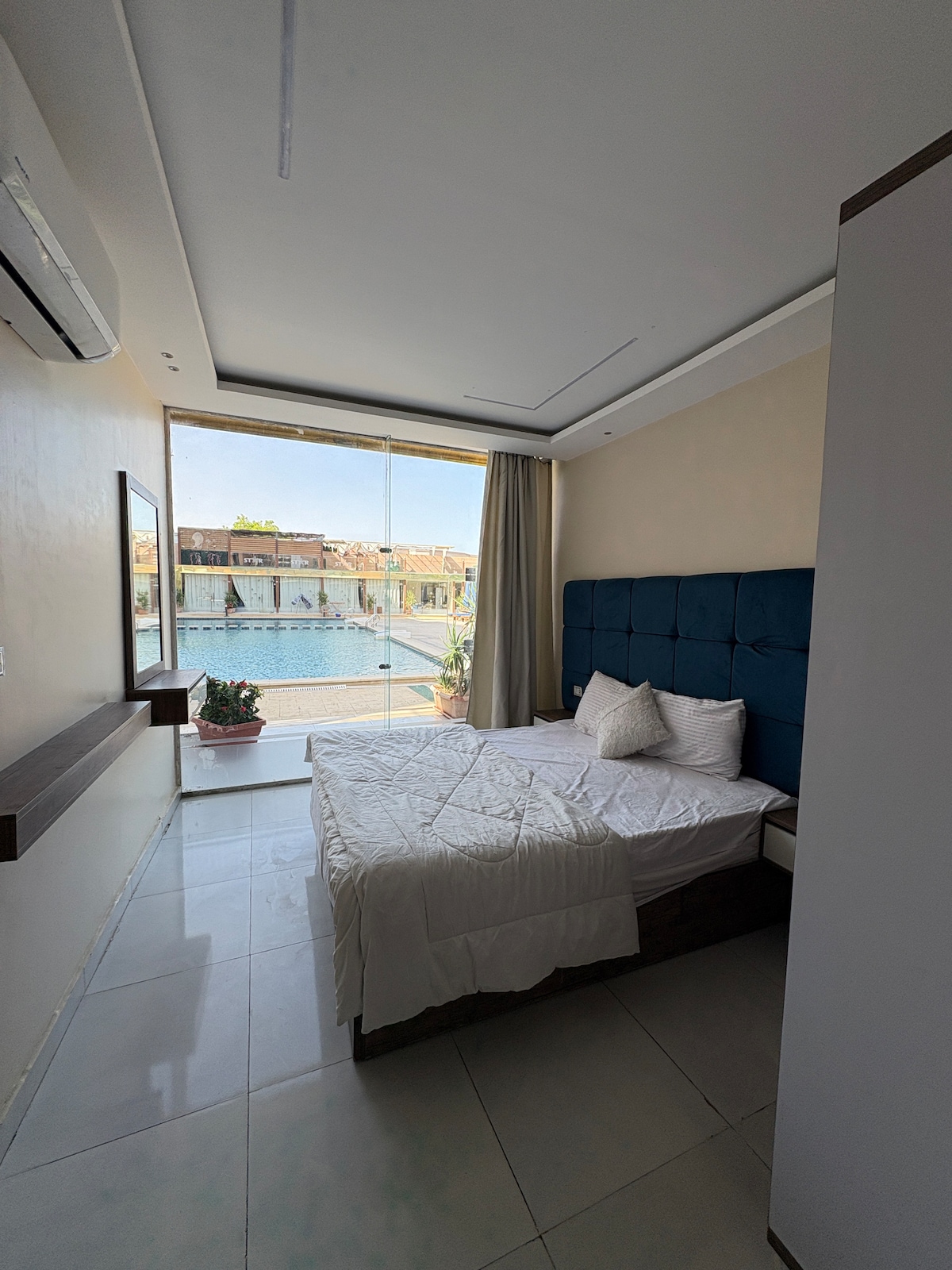 Wake up to views of the palm trees and the private pool. The glass window that lines the entire front wall is mirrored, so no one can look in, but you can look out. The villa is located first line on the beach with private beach access. There is also an in-house restaurant. Relax on the sun lounge & watch the sunset over the mountains, or sit and eat around the private pool. This hidden gem is like a little oasis located in Assala, the local side of Dahab, known for great snorkling & less noise.