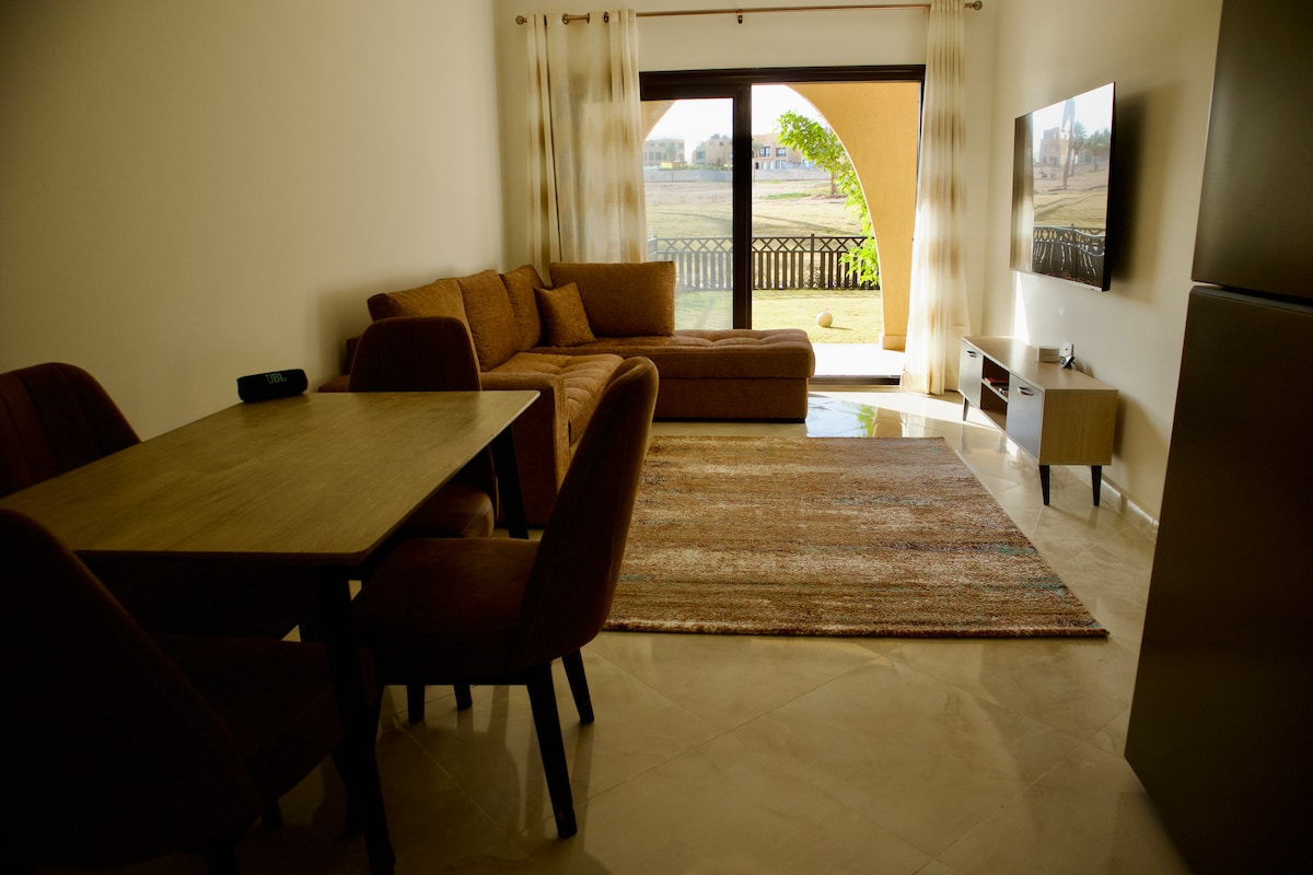 Holiday retreat located in Soma Breeze compound, Somabay is Egypt’s top holiday destination, amazing Snorkeling and Diving spots, Beaches, Golf fields, Kite Surfing, Aqua Park, Carting, Quad Bike, Restaurants, Supermarket, Bars with live music, Horses stable, SPA, music concerts. Apartment is on the 3rd floor which allows a very beautiful Sunny terrace with beautiful sea and mountain views. PS: There is a construction site 100m in front of the apartment, the work in the site ends at 4:30 PM.