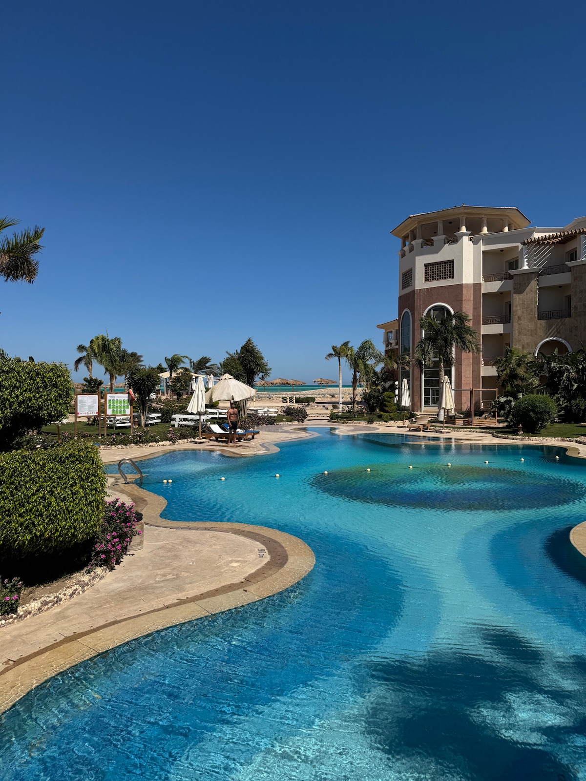 Experience luxury at Domina Coral Bay, featuring 1,200 rooms across 8 categories, Spa, villas and private apartments The room boasts an elegant design, comfortable beds, a private balcony with stunning views, creating a relaxing atmosphere The resort includes 3 buffet restaurants,4 à la carte options, 5 beach restaurants, 13 bars. Enjoy 3 floating pools and 8 traditional pools With a private beach stretching 1.8km and breathtaking views of coral reefs, it's the perfect destination for relaxation
