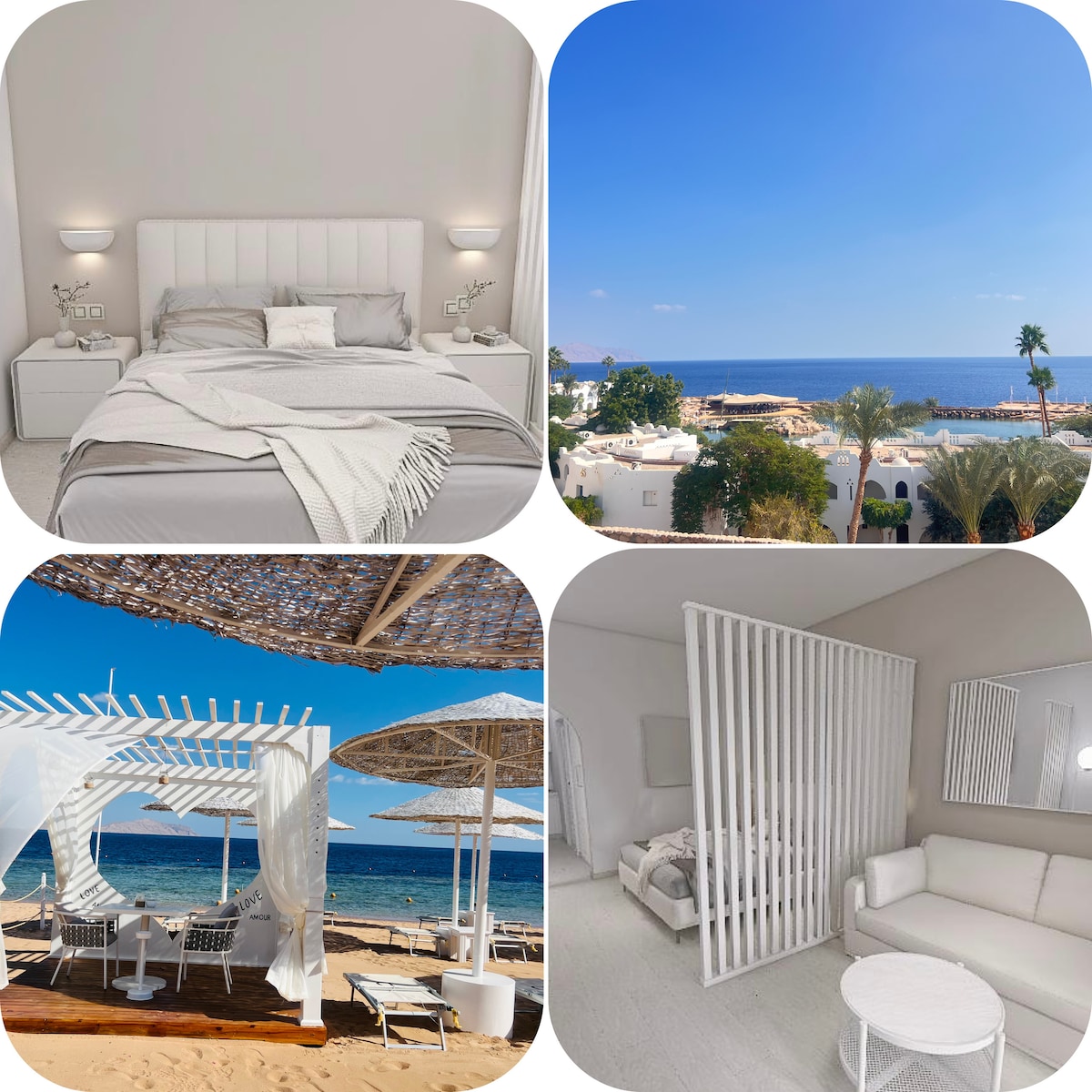 Stylish suite with breathtaking views of the Red Sea, Tiran Island, and lake. Enjoy stunning sunrises and moonrises from your private balcony in a comfortable, relaxing atmosphere. Include Free WiFi Location: In Domina Coral Bay, the largest resort in Sharm El Sheikh. Resort & Facilities: 2 km sandy beaches, pools, nightclubs, theater, kids club, free activities, diving, water sports, yachts, restaurants, spa, gym, shops, supermarkets, bars, hookah corner, casino, volleyball, paddle, and more.