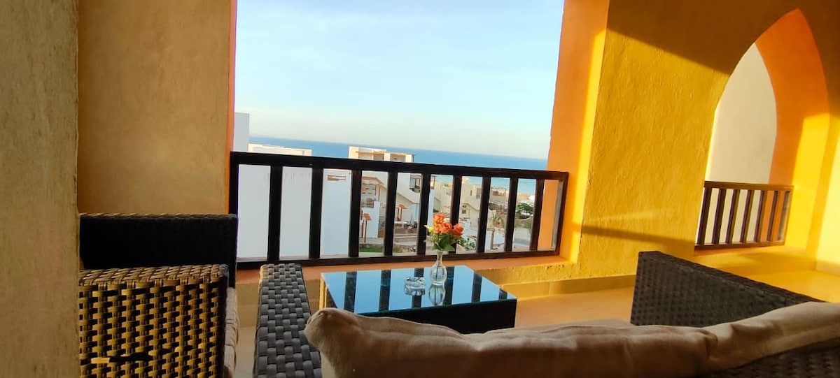 On the coast of Red sea, Egypt overlooking the majestic blue waters of the Red Sea, the most beautiful spot in red sea, 5 minutes to free snorkeling amazing reef and colorful fish, the mother nature views throughout terrace and windows. Nothing beats the balcony morning view of sun rise, and breathy weather. or sunset throughout living and bedroom windows. Kindly read ( Other things to note)