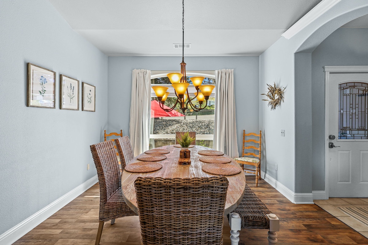 This gorgeous oasis in Redding is your perfect landing pad while visiting the area! We boast a pristine swimming pool, large backyard with stunning shaded relax & dining area, and hot tub for cold evenings. This home is central, yet quiet and safe. We have easy walking access to the Sacramento River Trail, so bring your bikes and sense of adventure! The home is bright, restful, modern, and clean. Free level 2 EV charger on-site.