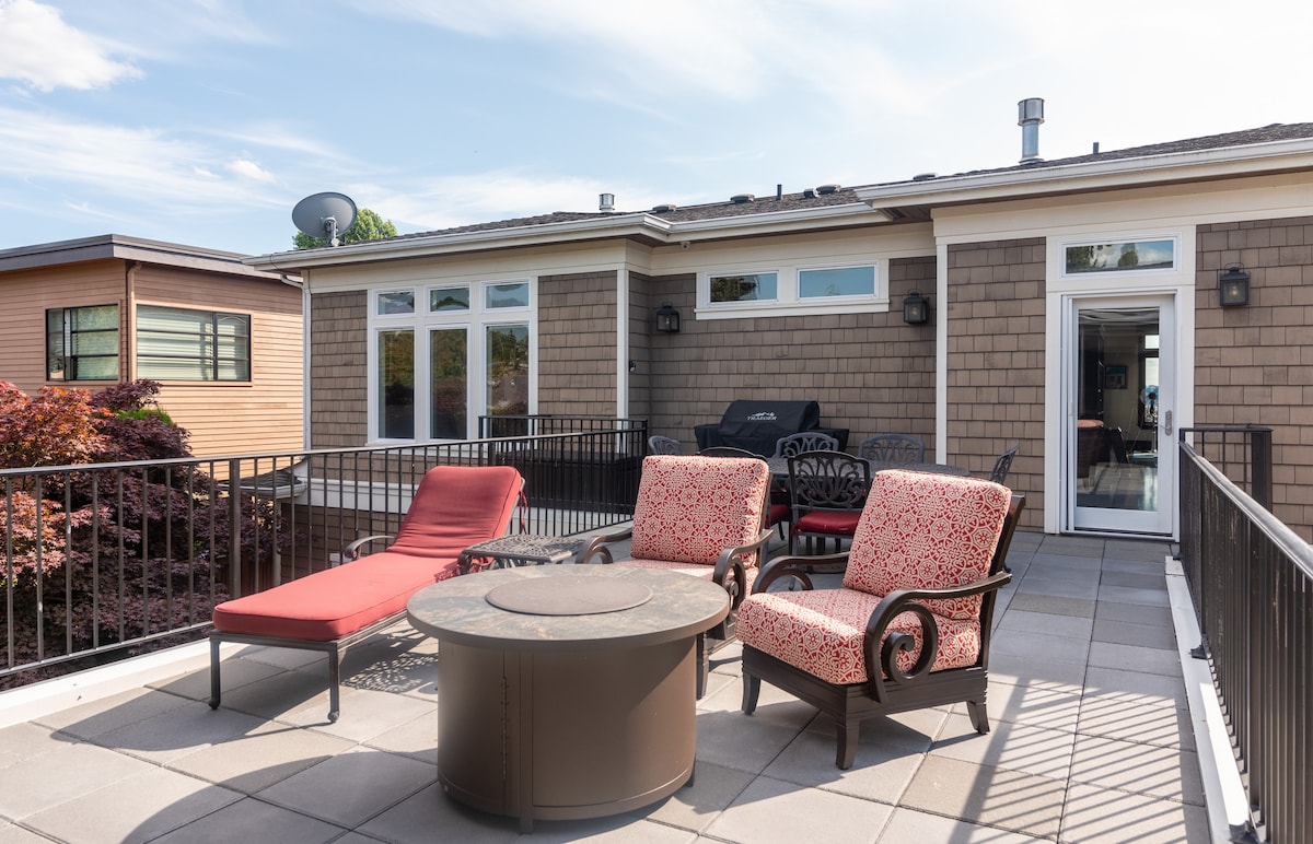 Modern farmhouse cottage on Lake Sammamish—2 bed / 2 bath with A/C and gas fireplace. Both bedrooms feature plush down comforters and pillows. Enjoy hardwood floors, a well-equipped kitchen with new appliances, washer/dryer, dining for 6, a sleeper sofa, 55” TV, and coffee bar. Relax with lakeview dining, kayak the shoreline, or explore the Lake Sammamish Trail just outside your door. Well-behaved dogs welcome!