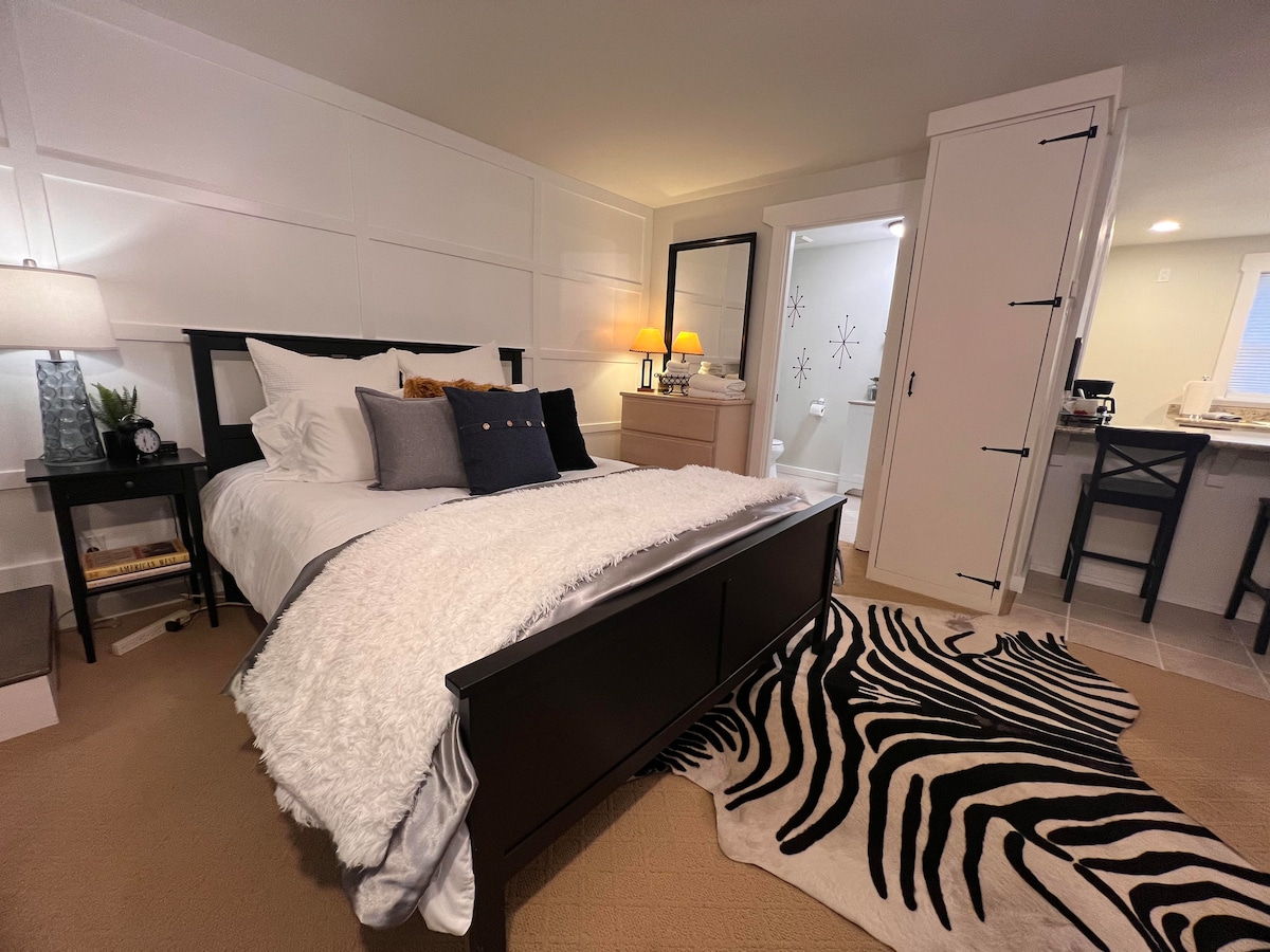 全新现代1间私人加大双人床套房,带卫生间和独立入口