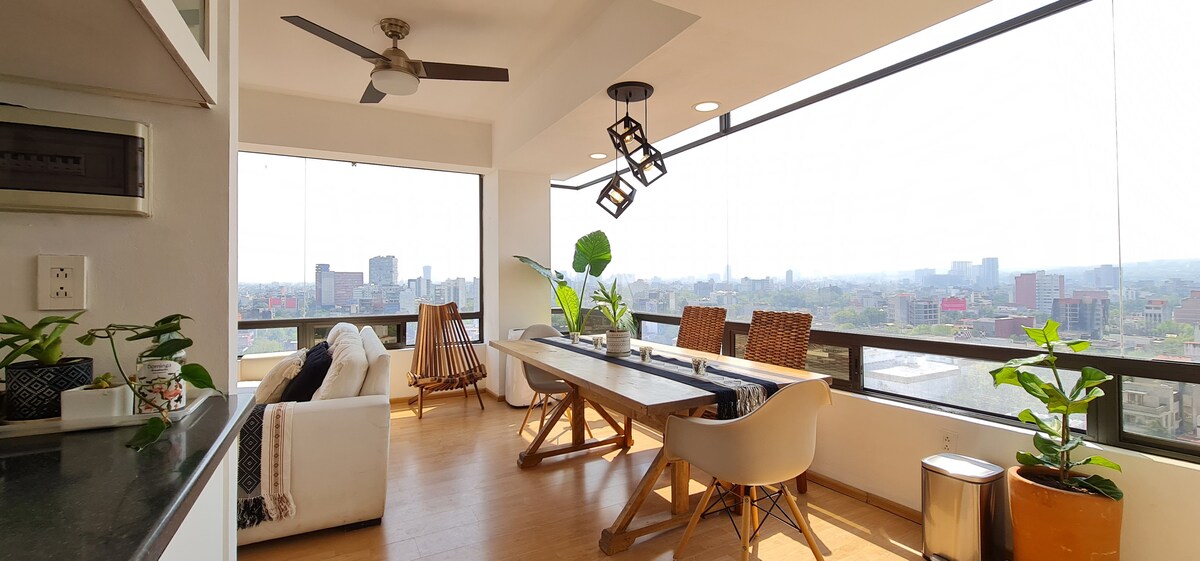 Enjoy this wonderfull 1 bedroom apartment: * Breathtaking Panoramic Views Skyline * One of a kind * Best Location Mexico in City * Super safe + Lots of Restaurants + Café´s + Stores & more * Top Amenities * 24/7 Concierge at the lobby * Super Fast & very reliable Wifi * Comfortable dedicated work space * Fully equipped Kitchen * Queen Size bed with European memory foam mattress. * Well thought and super comfortable space * Full of plants * Sparking clean and sanitized * Spacious * Full of Magic