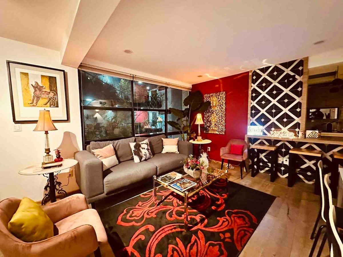 "Mexican traditions", located in a Porfirian building in Roma Norte, decorated with references to Mexican traditions. It has: spacious and equipped bathroom; washing machine strategically located; kitchen equipped with grill, microwave, and refrigerator; dining room with table and chairs for four people; living room with sofa and chairs to relax. Master bedroom with king-size bed, closet, TV and air conditioning. Access to the garden from the living room and bedroom. Ideal for extended stays.