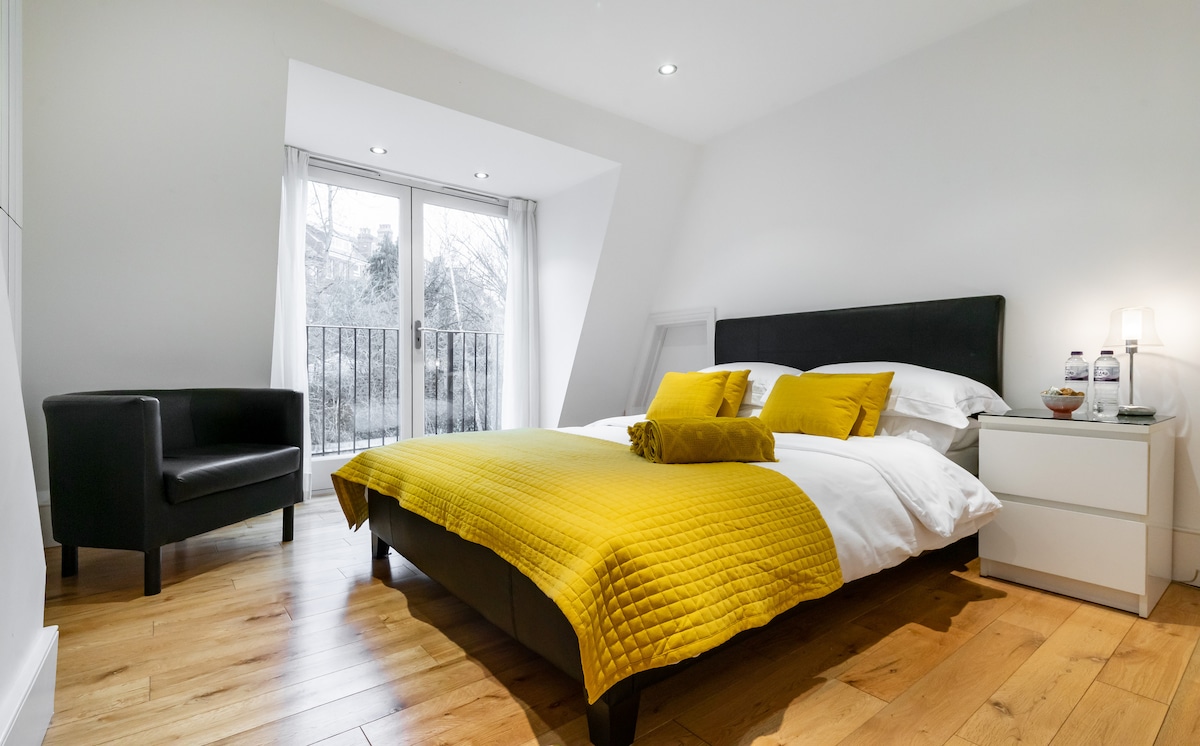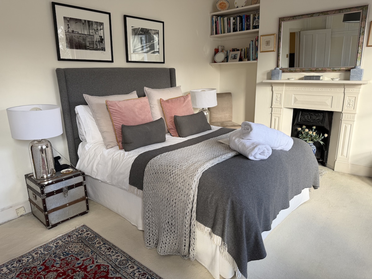 A bright and spacious bedroom located across the top floor of this Victorian maisonette. The kingsize bed is fitted with a sumptuous wool topper and luxury hotel bedding. There’s a sofa and plants to add that homely touch. The ensuite bathroom is supplied with high-end toiletries and towels. There is a large walnut desk, ergonomic chair, DAB radio/Bluetooth speaker, iron, hairdryer and a fitted wardrobe with wooden hangers.