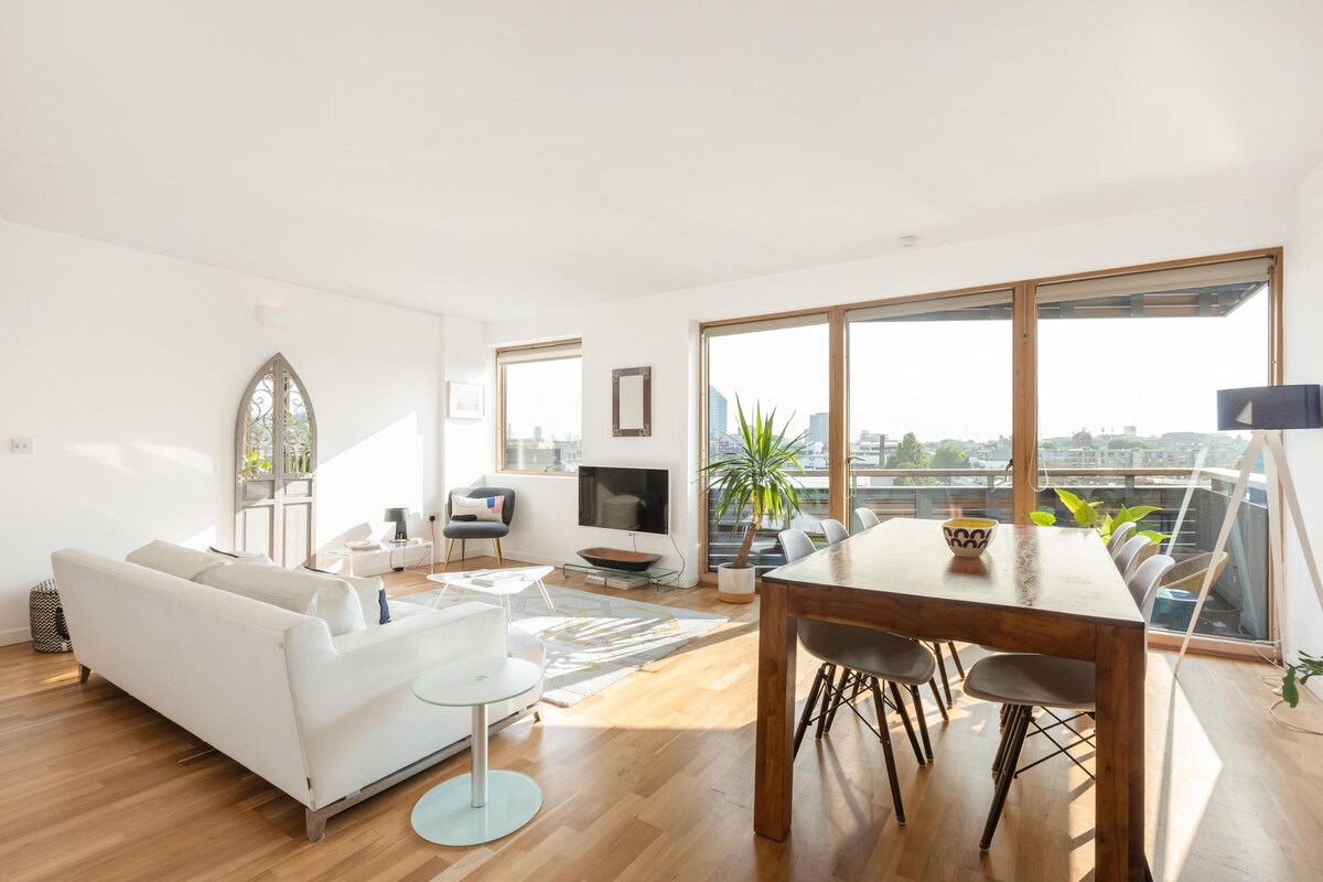 Welcome to our stunning penthouse apartment in London. Enjoy 180-degree views of the London skyline from your private roof terrace. Perfectly situated to explore the whole city, with Underground transport links all within a short walk. The building overlooks Regent's Canal and is directly opposite Shoreditch Park. It also has a family-friendly pizza restaurant, café, gym, and supermarket - all within the building. *Additional House Rules apply, please read them before booking.
