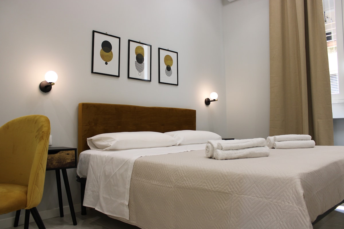 Double room with single beds convertible on request into a double, equipped with king size beds, air conditioning, parquet, mini bar, 50" Smart TV and exclusive bathroom in the room, in a sophisticated B&B with attention to the smallest details and consisting of 3 bedrooms all with private bathroom. Common spaces: living room and possibly kitchen. The rooms guarantee a comfortable stay. Location full of shops, a few steps from the Duomo, the Zaera Market, the Court, the University.