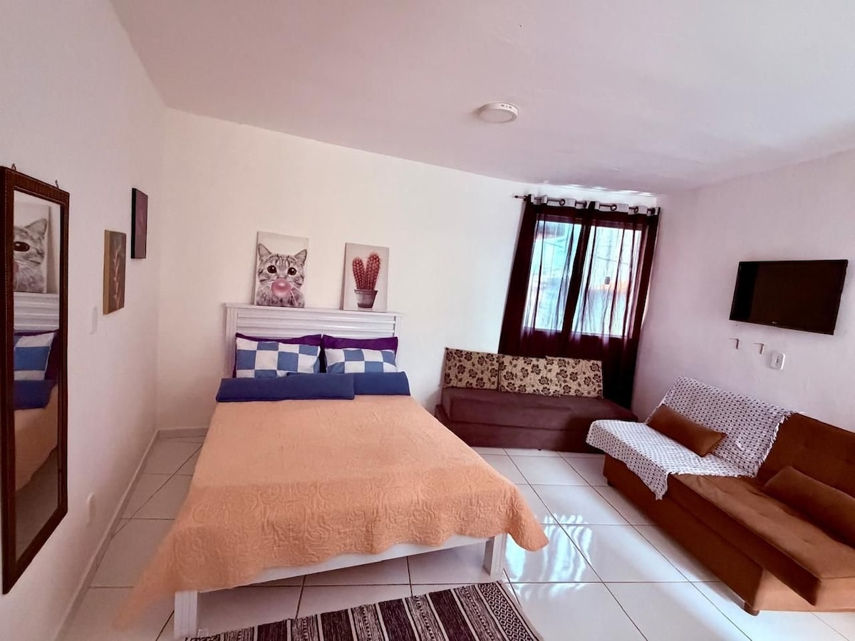 A 6 min a pé da praia. Pertinho de tudo, padaria, farmácia e mercado. Transporte como ponto de ônibus e táxi na rua do local.Se trata de uma Studio simples, quarto com cozinha , banheiro privado, varanda, AR, wi fi, cama de casal, colchão de casal extra , tv com acesso a internet, fogão cooktop e geladeira Localizada em uma vila, ambiente familiar, onde moro com minha familia, conceito guesthouse*Temos mais opções de suítes* *não somos pousada*