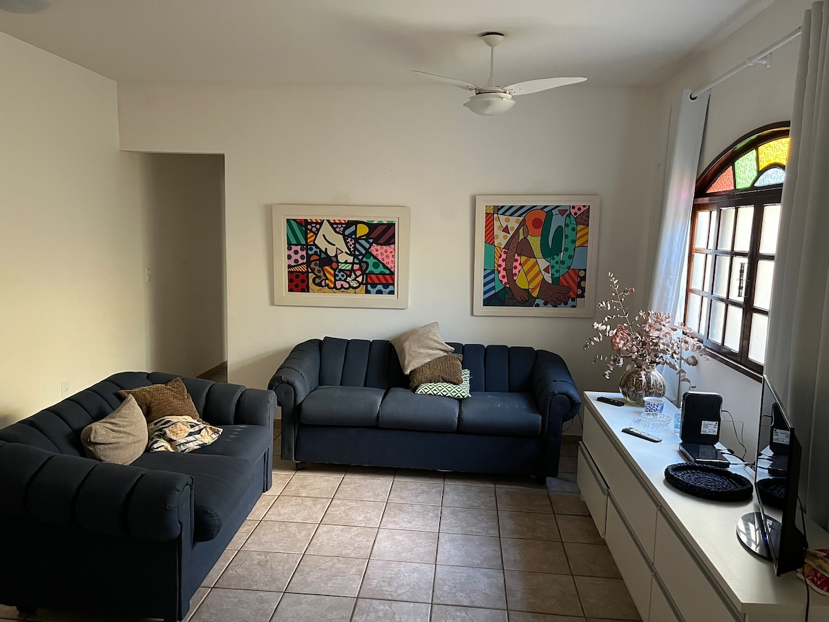 Cozy beach house on the ground floor of the condominium, with a two bedrooms and a living room, full social bathroom, well equipped kitchen and a parking space for one car in the condominium. Besides being close to the beach (2 blocks), it is close to a good trade (bakery, pharmacy, supermarket, restaurants, etc) and 1 km from the bus station. The house is great for couples, families with children and groups of friends.