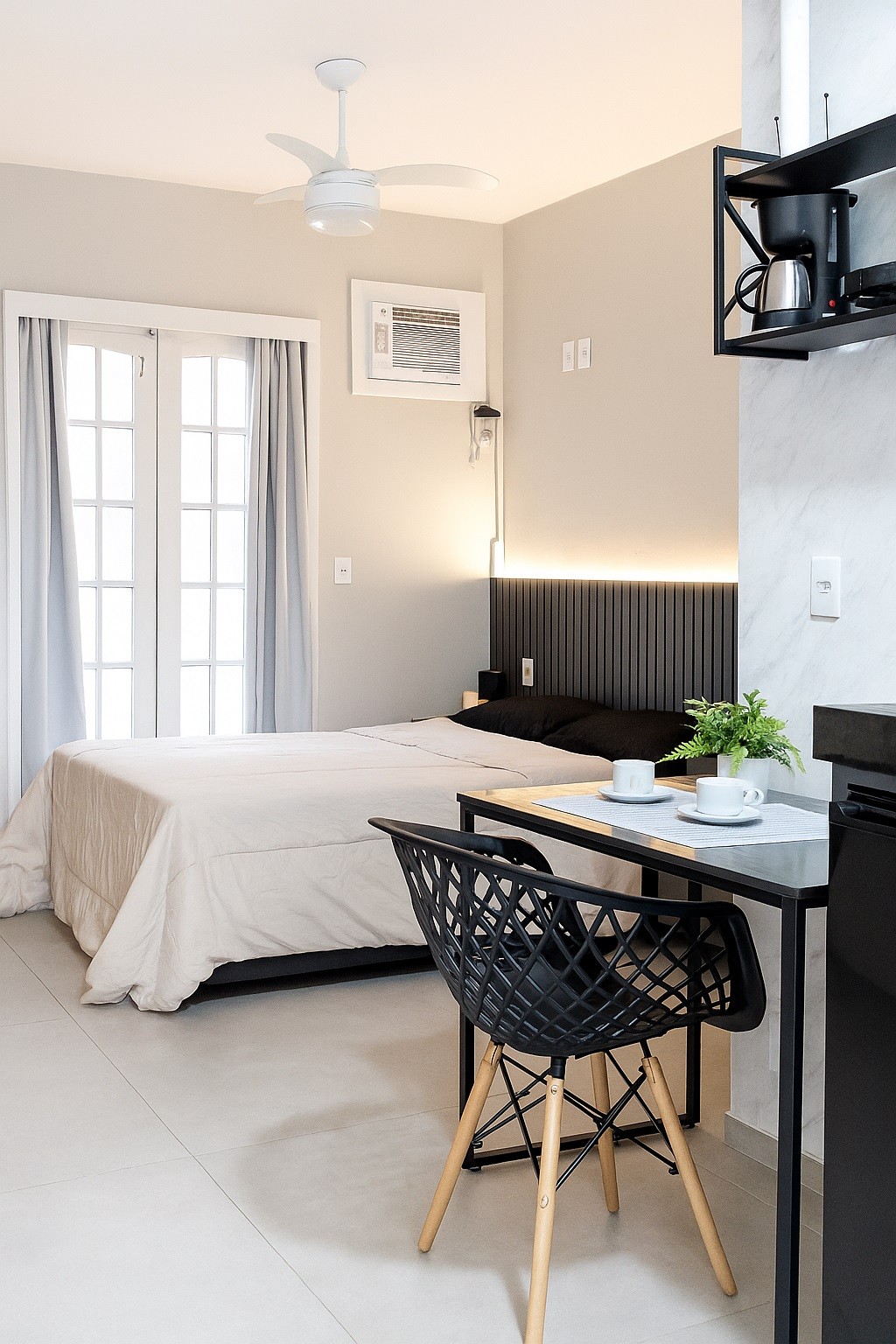 Acorde sentindo-se descansado enquanto a luz suave da manhã inunda as janelas expansivas deste apartamento. Observe o mar enquanto relaxa na área externa da varanda. Desfrute de um sono tranquilo em uma cama queen size com enxoval cheiroso e sinta-se em casa. Na cozinha, prepare seu café delicioso apreciando a melhor vista mar que Búzios têm para oferecer.