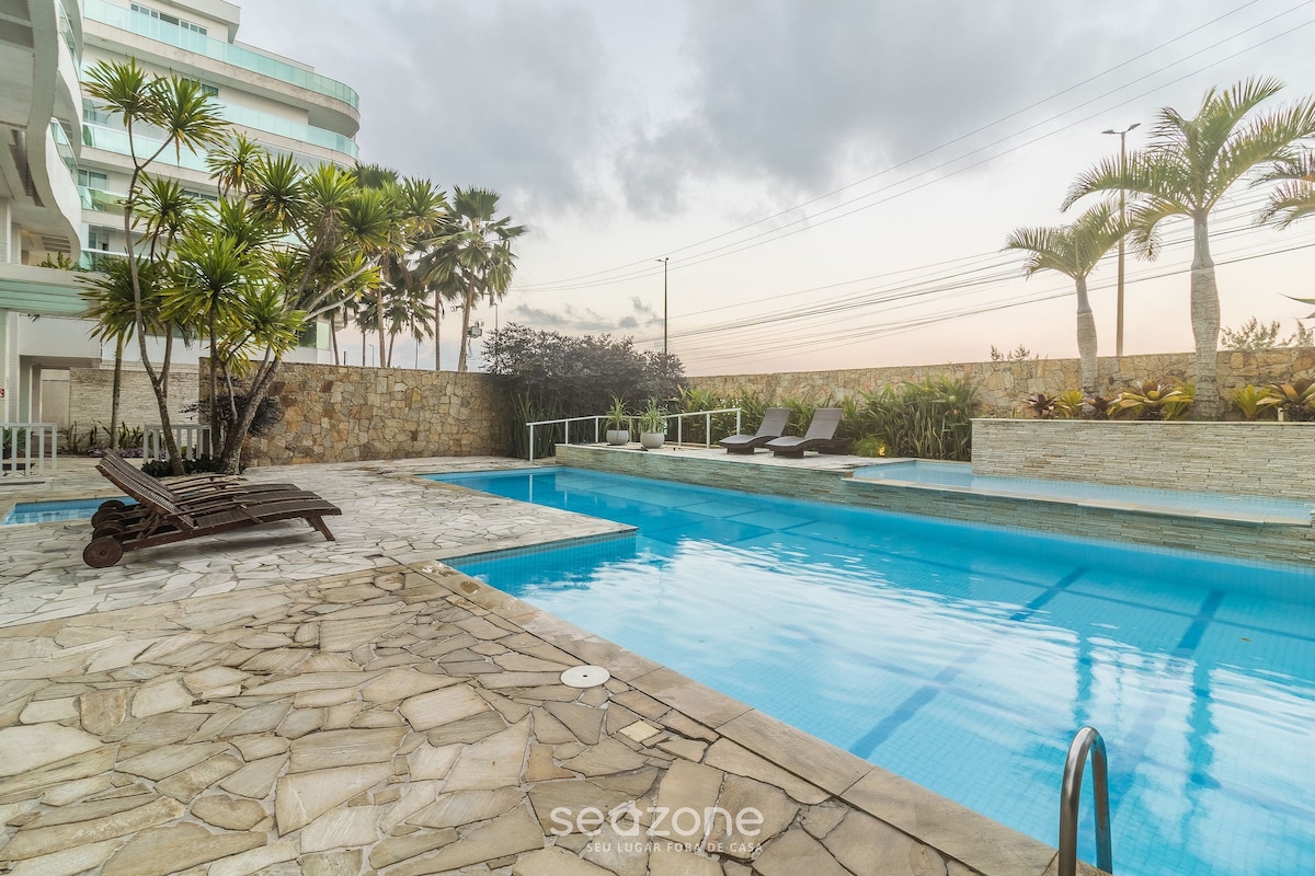 Flat frente mar, em uma praia fantástica a seus pés. Varanda com uma vista maravilhosa, cortina de vidro, suítes, cozinha básica , 1 Smart TV, WiFi,vaga p/ 2 carros. Flat bem localizado dentro do condomínio. Flat ideal p/ 4 hóspedes, flat arejado e claro, com uma varanda pequena sem cobertura para pegar sol. Prezados, quando alugo para duas pessoas e não for um casal, por favor avisar. No banheiro de solteiro o box só tem uma folha de vidro ( funciona melhor assim).