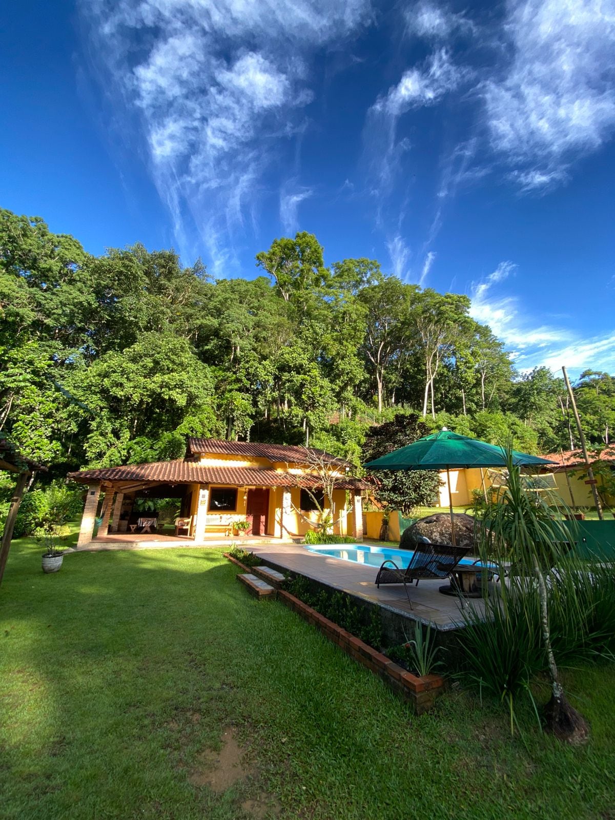 Casa rústica e aconchegante com amplo espaço externo com piscina, ideal para você curtir com a família e grupo de amigos. A casa é rodeada de montanhas e oferece uma bela vista do nascer do sol. Localizada bem próxima ao rio que margeia o condomínio, possui fácil acesso a um ponto de banho com águas claras (exceto em caso de chuva forte) e uma pequena “prainha” natural no leito do rio, ótima para relaxar.