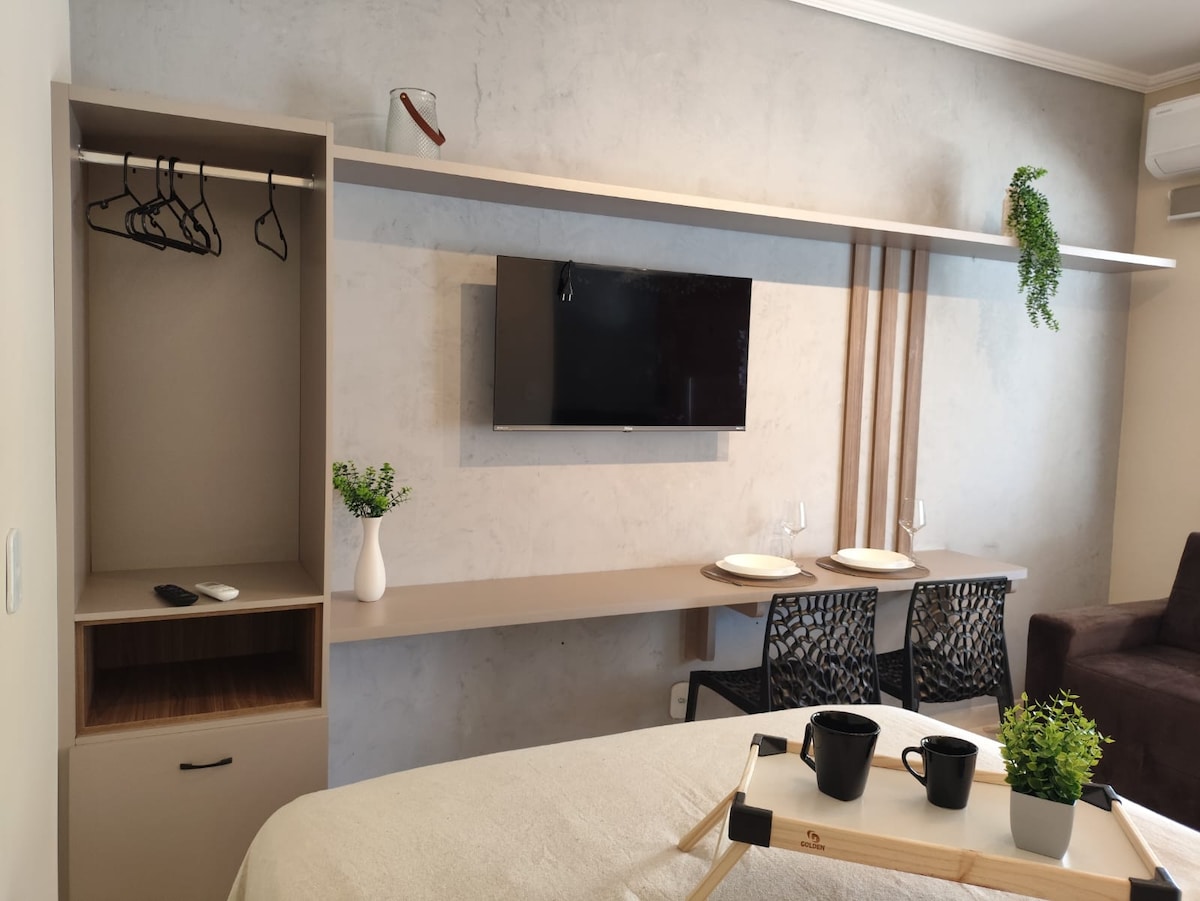 Relaxe com toda a família nesta acomodação tranquila. Flat novo, com móveis novos, com cama confortável, ar condicionado, ventilador de teto, TV smart 32" com TV a cabo e Netflix. Cozinha equipada com microondas, refrigerador, cafeteira, sanduicheira, pratos, copos e xícaras. Flat com uma rede para descanso e mesa na varanda. Banheiro com box é chuveiro elétrico. Estacionamento para até 5 carros e churrasqueira compartilhada.