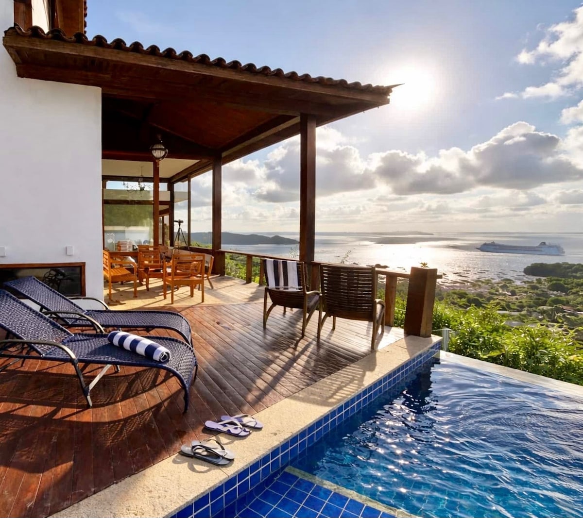 Residencia deslumbrante en la Rua Q de Ferradura, donde disfrutar del amplio paisaje con vistas de la playa de Ferradura, las olas, las rocas, colinas, gran piscina, exuberante jardín y vista panorámica hasta los cruceros que llegan a Buzios. Arquitectura de diseño, materiales, muebles y equipamiento de la mejor calidad, ventilada y luminosa, decks, amplios ventanales. Ideal para tus vacaciones familiares o con amigos, en una casa cálida y sofisticada, rodeado de naturaleza