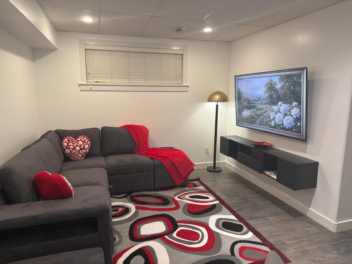 Welcome to your Eastbrook cozy basement-step through the staircase nook, kick shoes off on the cushioned bench, hang your coat on the handy rack, then sink into our Tempur-Pedic queen mattress that molds like zero gravity. Pull-out sofa flips out for two more, so four fit easy. Full kitchen’s no joke: dishwasher, four-burner stove with range hood. Toss laundry in the washer while you chill. Whole space feels huggy-warm, no clunky stuff in sight. Wi-Fi, TV, all that. Perfect hideout.