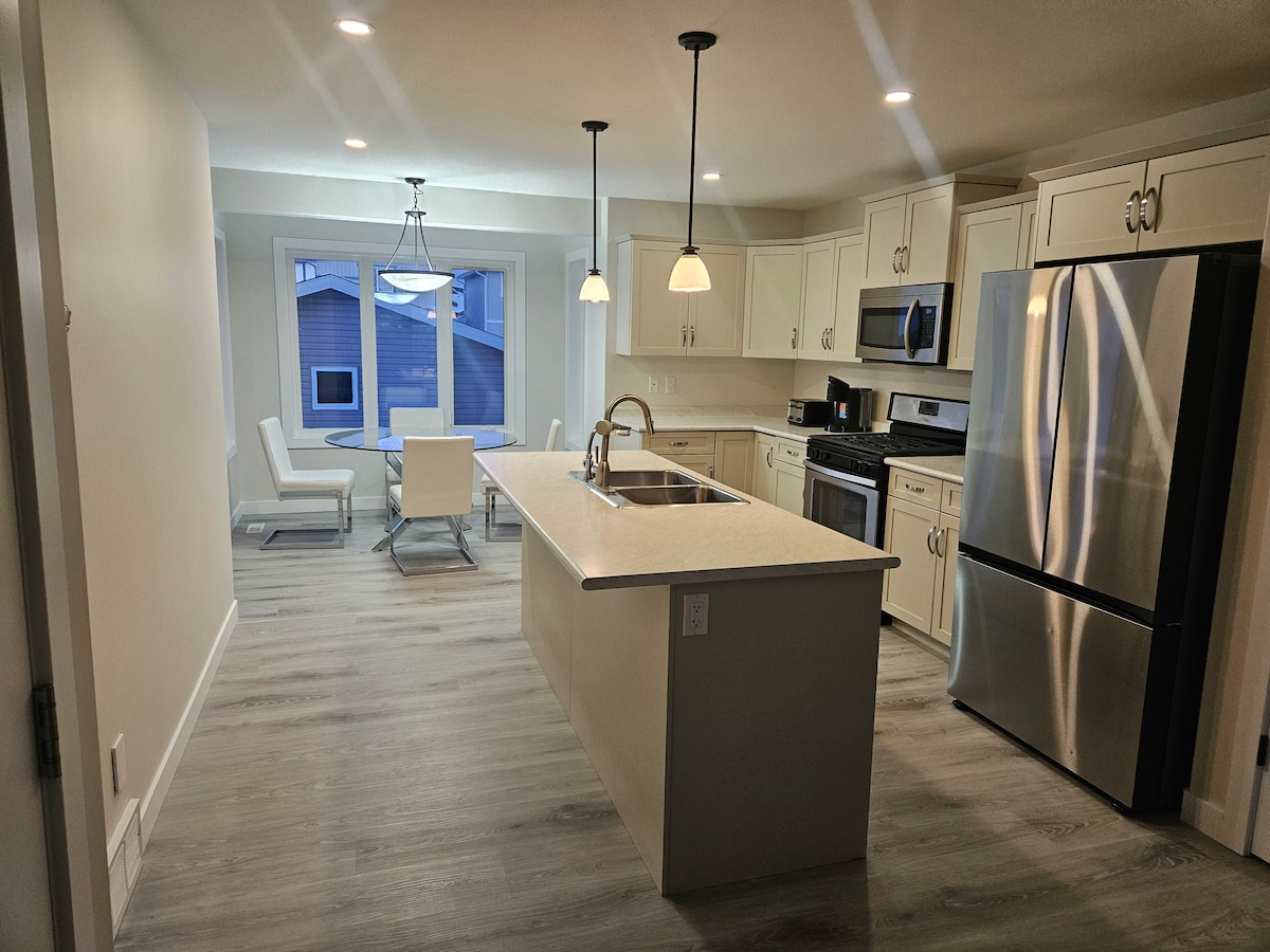 Home was completed in 2022. Nicely finished open concept with vinyl plank flooring and an abundance of cabinets. You will appreciate the quiet stay with added insulation and triple pane windows. 2 double beds, Queen and a pull out sofa in the living room., providing 4 sleeping areas. The kitchen is well stocked with all appliances. You will have an in-unit washer/dryer. Close proximity to downtown and the Casino as well as General Hospital. Plenty of off street parking. Top unit of a duplex
