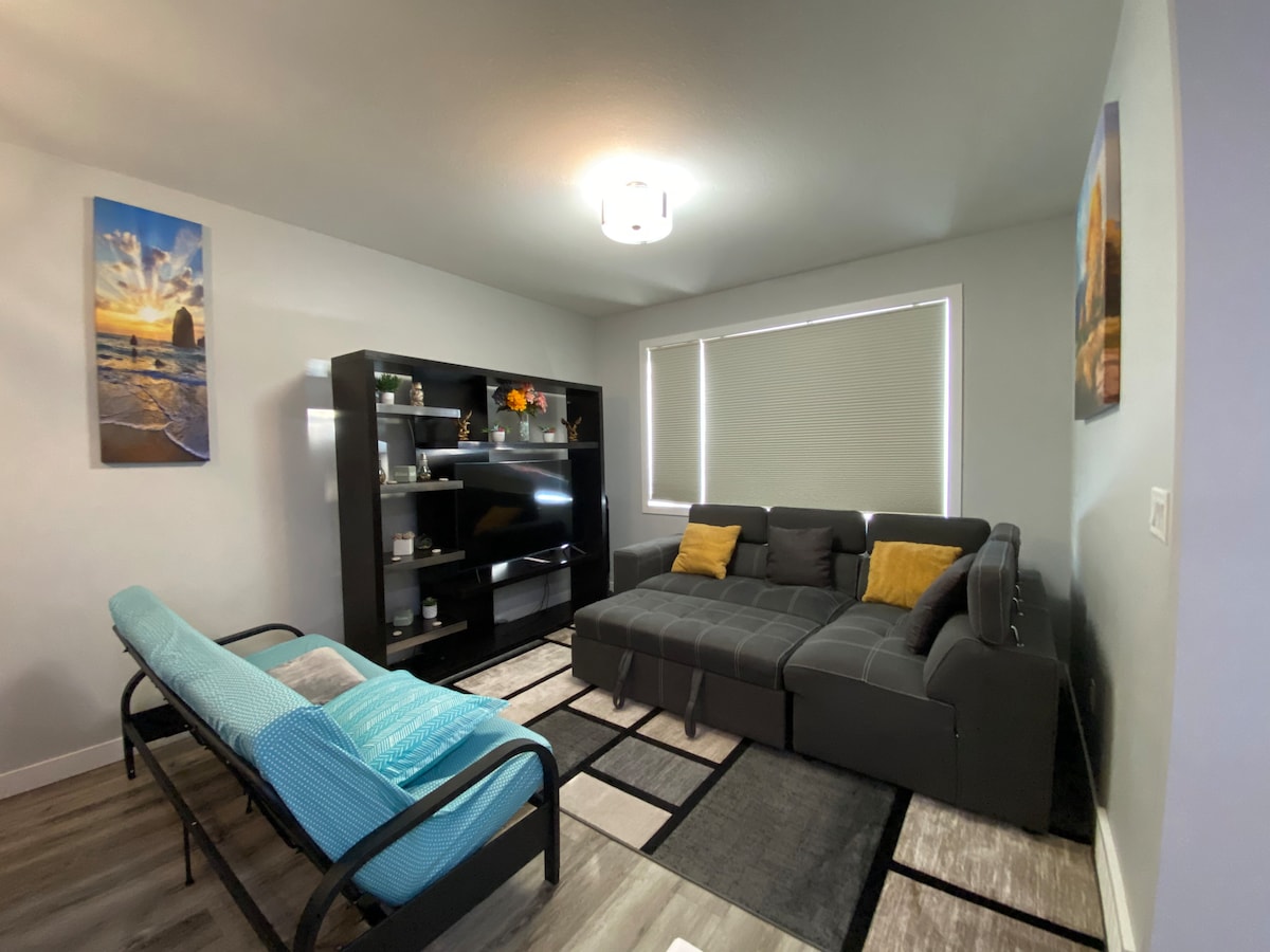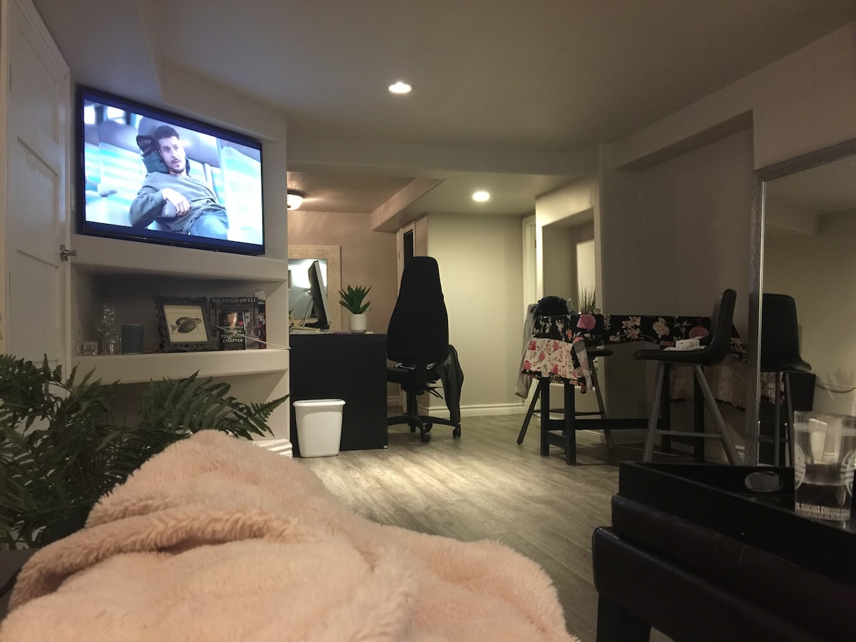 Spacious and private one bedroom basement suite. This home has operated as an Airbnb for several years. Our home is located in a quiet and safe neighborhood. Large windows bring in lots of natural light, welcoming you to this home. It comfortably sleeps 2 people, with an additional 2 being able to sleep on a double air mattress/couch if needed. We are a short drive to downtown, the airport and the stadium. We cater to all and welcome you to stay!