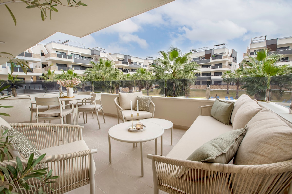A modern, two-bedroom apartment with a spacious terrace in the heart of Playa Flamenca offers comfortable interiors, two bathrooms, a fully equipped kitchen, a washing machine, a hairdryer, a dishwasher, and air conditioning. Each bedroom and the living room feature a Smart TV. Complex amenities include pools - two of which are heated year-round — a jacuzzi, sauna, gym, playground, bar, and underground parking. Close to beaches, shops and restaurants. Perfect for an unforgettable stay!