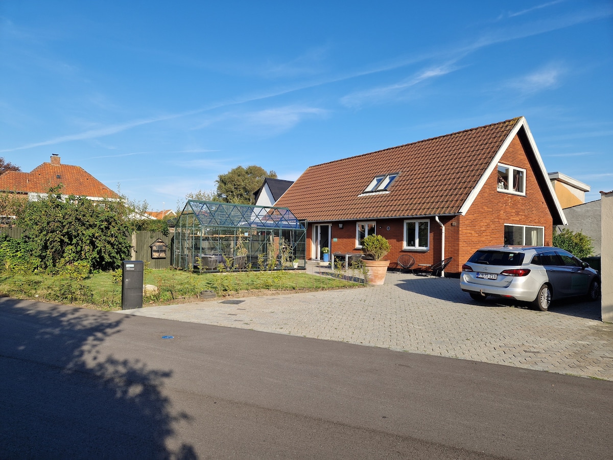 You have easy access to everything from this perfectly located base. Newly renovated with new kitchen and bath. Luxury shower. Ground floor: Kitchen, Bath, Living room with Tv., bedroom continental bed, Office and hall. First floor - two rooms and additional living room with sofa + floor soap. One room with box-mattress and one room with junior bunk bed. 1.5 km Torv, Musikhuset, Water Tower 1.0 km Broen Shopping, cinema, hospital, hospice, pedestrian street, train station+Shopping + Pizzaria