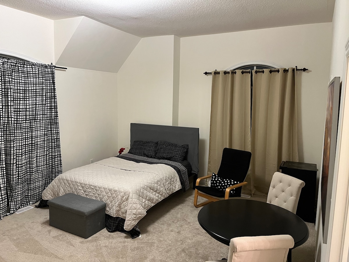 - Free street parking - Great pitstop for travels along the 401 (exit 399) - Open concept space with private bathroom - Queen bed, fast Wi-Fi, and mini kitchen bar - Kettle, microwave, and coffee station included - Cozy workstation for remote work or email - Convenient location near transit, shops and restaurants - Pickering Casino (10 min drive), Pickering Golf club (2 min drive), Bubble tea, Rollz Ice Cream, Good Life, Shawarma, Mexi Guac within a 4 min drive -A cozy ~200 sq ft resting place