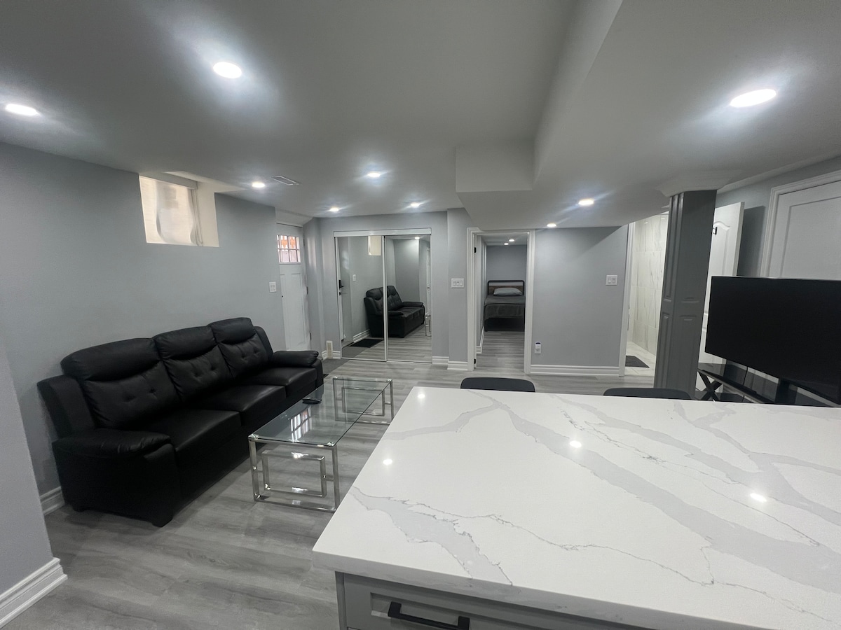 Legal Basement - This chic place comfortably accommodates up to 5 guests and comes fully furnished. There are 2 bedrooms, each accommodating 2 guests, along with a daybed in the living room for the 5th person. One bedroom offers a queen-size bed, while the other has a double-size bed. Also, there are 2 study tables with chairs, one in each bedroom and one in the living room. The meticulously designed kitchen boasts modern and luxurious touches. The stylish washroom features a standing shower.