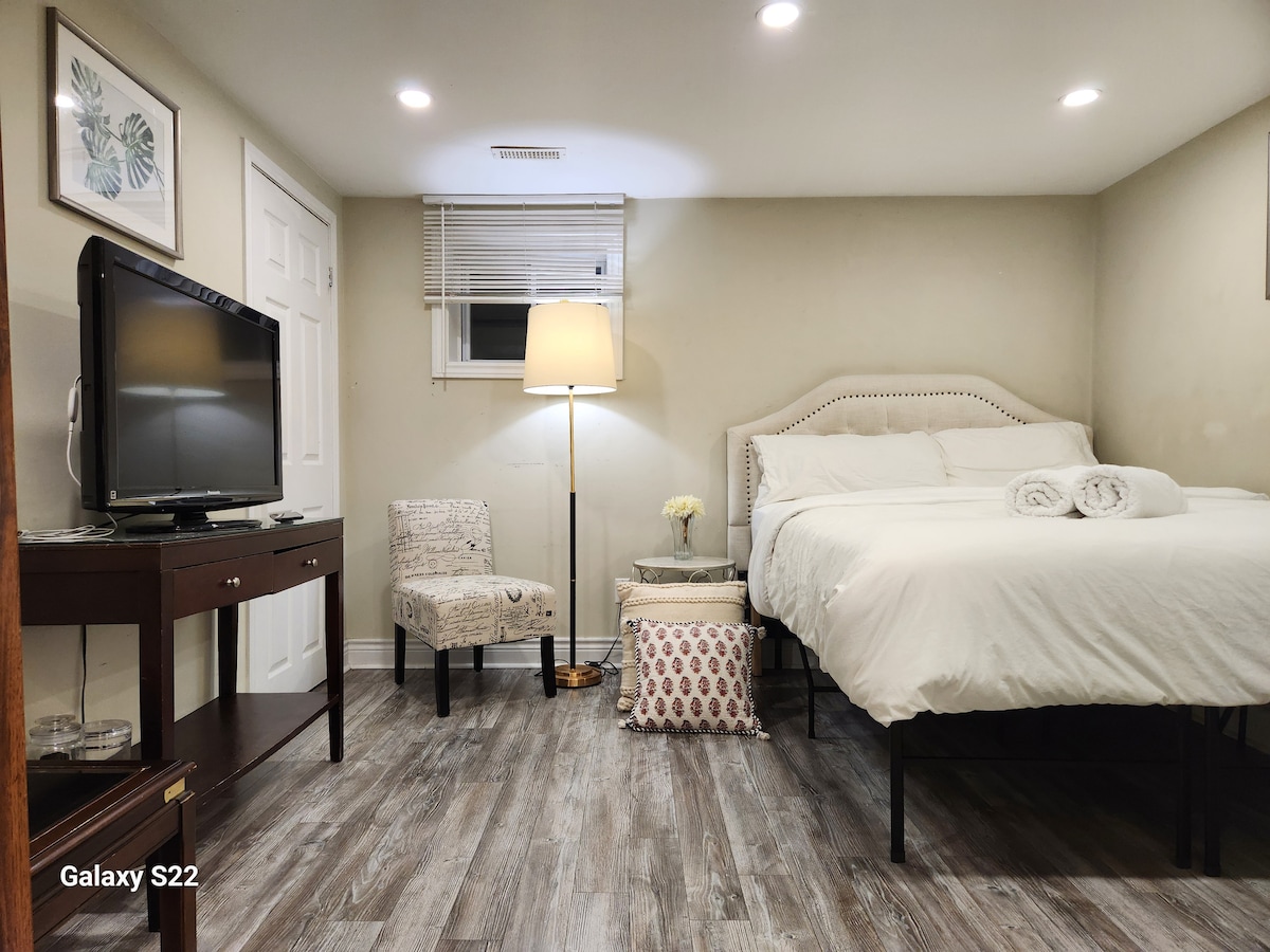 在这个宁静时尚的空间里尽情放松身心 🎈A fully renovated basement double room . Equipped with a brand new 1.8-meter Q-size mattress. ♡This comfortable and cozy room features a 55-inch HDTV and comfortable chairs. ✨️Quiet and elegant community, clean and tidy. ✨️Walking Mall, Near supermarket,Catering center,The bus stop is also within easy reach 2 minutes walk to TTC. Wamart, Best Buy,Superstore ,Pizza Pizza ,Tim Houston and Bank More,5 minutes drive to highway401 24-hour hot water Rogers high-speed Internet
