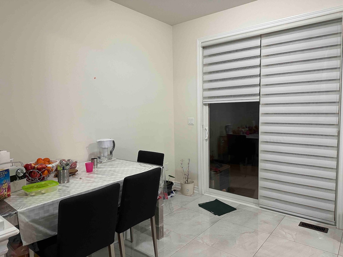 Bring yourself to this excellent place for a peaceful family-friendly stay. The Place is near YYZ Toronto Airport, the Go Train station for downtown Toronto, and walking to food outlets, Cassie Campbell Community Centre. Our Place is highly sought-after and has top-rated reviews by our guests. The place is warm and well-lit to provide you cozy comfortable stay. Ensuite private bathroom, walk-in closet, modern kitchenette with dining island space. spacious exercise and yoga area.
