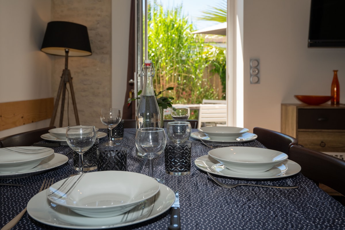 Duplex 30 m2, accolé à la maison du propriétaire-accès indépendant. Rdc : kitchenette(frigo, micro ondes, mini four, plaque cuisson, cafetière) coin repas et canapé, Wc. Etage : 1 chambre lit double (possibilité lit bébé, accès enfant sécurisé), salle d'eau avec douche et double vasque. Cour avec table et chaises de jardin. Abri à vélos et motos. Marché et commerces à 100 m à pieds. Accès à pieds au port de plaisance et au chenal de la Cayenne, restaurants, cité de l'huitres. Promenades à vélos