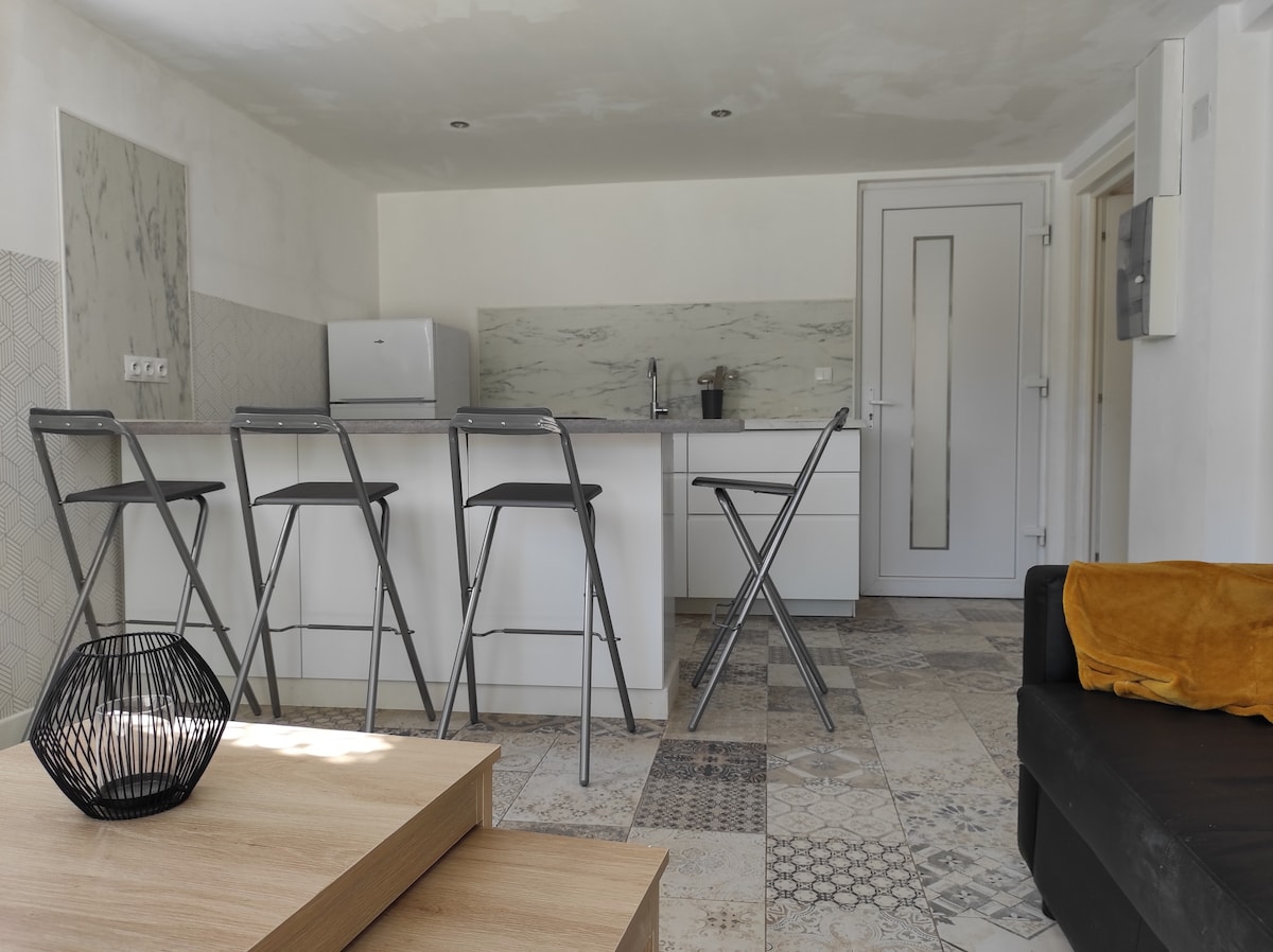 Bas de maison 2 pièces avec entrée indépendante. Le logement se compose d'une grande entrée aménagée, d'un séjour avec canapé lit, d'une grande cuisine équipée et d'une chambre (lit 2 places). Une belle véranda donnant sur la terrasse et le jardin extérieur, fait partie du logement. ℹ️ Possibilité d'utiliser le barbecue sur demande avant votre arrivée et séjour (espace partagé avec les propriétaires). ⚠️ Jacuzzi disponible uniquement de octobre à avril ⚠️