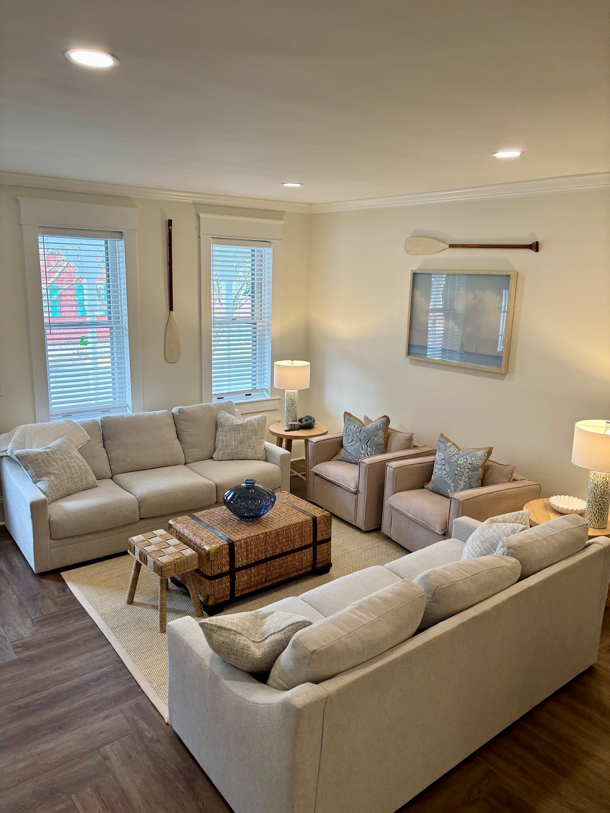 Great energy and a calmness through out our newly renovated end-unit townhouse. Located only 3 miles from the beach, this home boasts two master bedrooms with ensuite bathrooms, one of which is located on the first floor. Fully equipped kitchen for the nights you may want to cook, comfortable accommodations for adults and children, and a relaxing atmosphere that welcomes you to the "slower, lower way of living".
