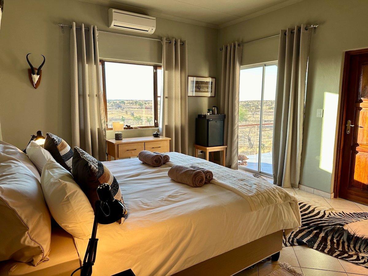 This very unique, private cabin is truly special because of the beautiful views of Namibian fauna & flora, wild animals grazing at the lake below (or coming to your doorstep!🤩) and magnificent sunsets! This cozy, romantic cabin is selfcatering, but meals can be ordered. The price is per person per night. A sleeper couch (for a small kid) is in the study room. The location might not accessible for a very small sedan, a 4x4 vehicle is recommended. Closest shops/restaurants are in Windhoek.