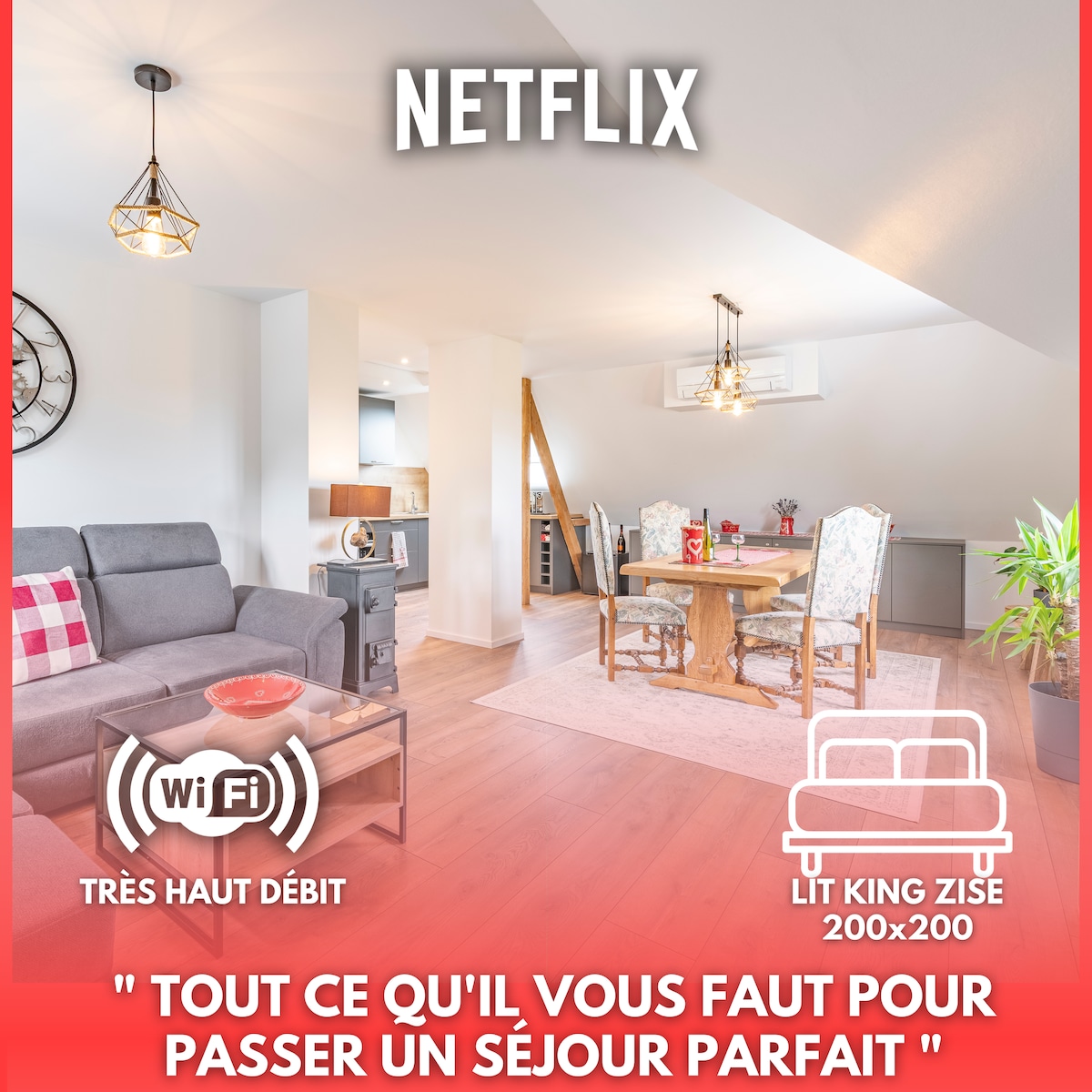 Découvrez notre élégant loft de luxe, un véritable cocon de raffinement et de passion, conçu pour une escapade inoubliable. Envie de raviver la flamme ou de surprendre votre moitié ? Offrez-vous une nuit romantique dans un cadre d’exception, agrémenté d’équipements et d’accessoires haut de gamme Pour sublimer votre expérience, des options supplémentaire sont également disponibles. Si c’est pour se faire plaisir, autant le faire sans compromis !