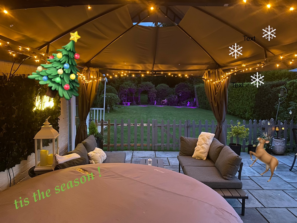 Enjoy A Festive Escape From It All To The Peace And Tranquility Of Rural West Sussex Private Self Contained Detached Chalet & Super Comfy Spa Tub Available 365 Days A Year ! Large 4m x 3m Gazebo with all around sliding zip up curtains.. access adjacent & available All Night.. This listing price includes the Chalet along with the Hot Tub Set Up To Max Temperature and includes all heating costs and sanitation fees, fresh towels, gowns, disposable slippers and complementaries..