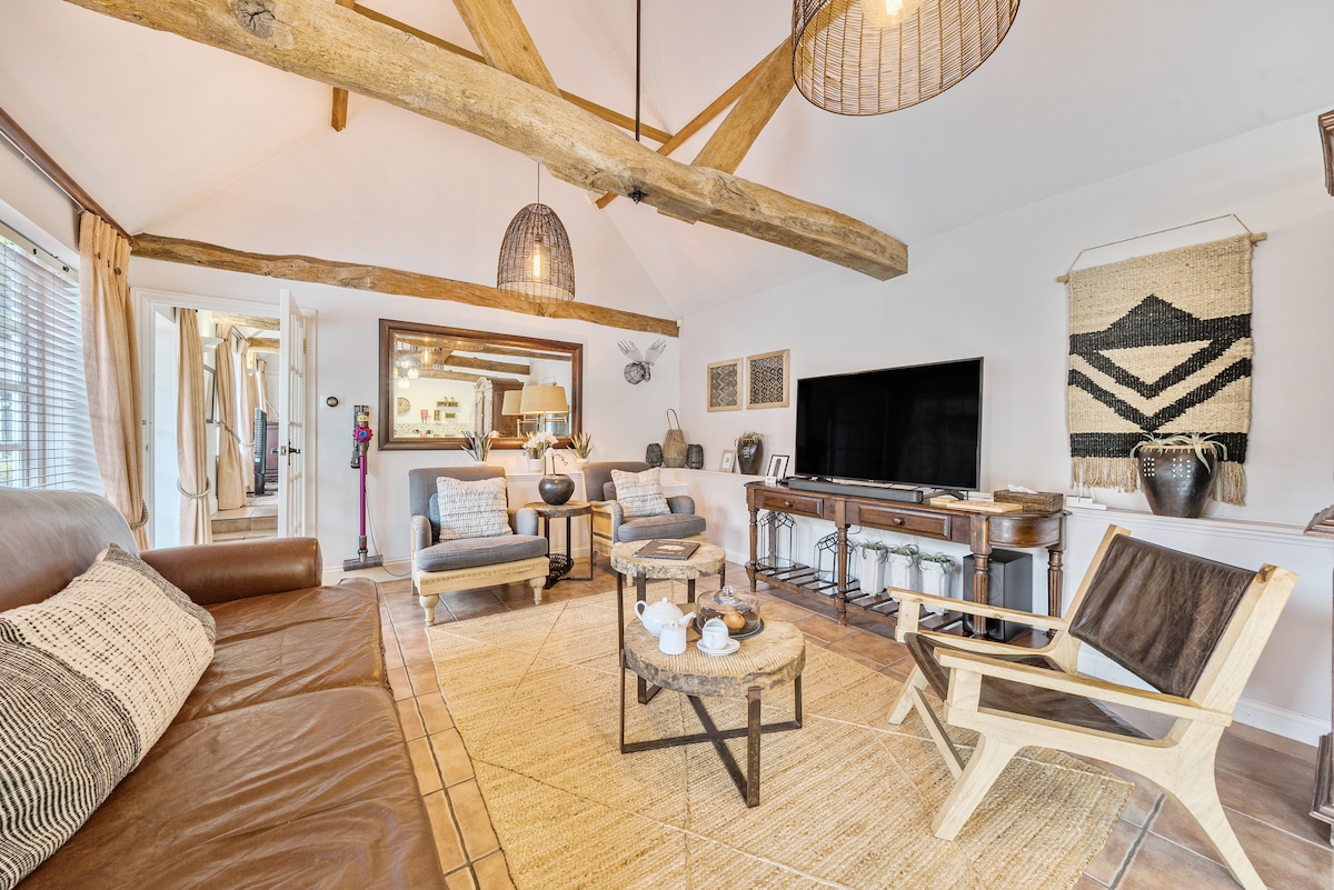 Charming 17th century Barn conversion. Restored with every attention to detail, abundance of character & exposed beams, fully equipped kitchen, attractive bathroom with roll top bath & rain shower. Underfloor heating, High Speed Wifi, Smart TV and optional hot tub. Just 14 minutes from Gatwick Airport/Station & the Express into London takes only 30 minutes, yet the Barn is set in open countryside, surrounded by fields, on an Equestrian property