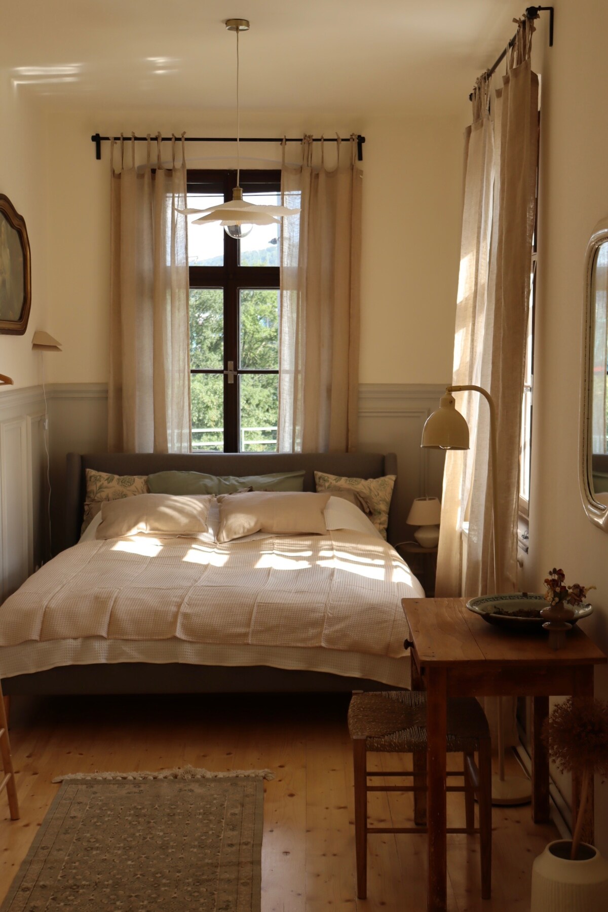 The newly renovated 70sqm apartment is located on the first floor of a house on a hillside in the small village of Schöna, 6km from Bad Schandau, 200m from the forest. Apart from windows and doors, only natural materials were used. It is heated by a stove that can also be used for cooking and baking. In addition, an electric 2-plate cooking hob is available. Take trips to Dresden, the National Park or the neighboring Czech Republic. We will be happy to advise you.