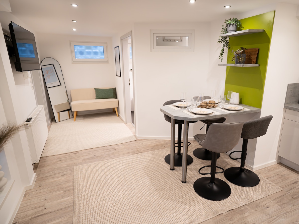 Unser kleines Apartment liegt in unserem neu gebautem Haus in traumhafter Lage in Bonn Oberkassel - direkt am Wald und ca. 10 Laufminuten zum Rhein. Alles bei uns ist neu und modern aber mit einem hohen Grad an Gemütlichkeit. Das Zimmer verfügt über alle Dinge, die man als Reisender braucht. Unsere kleine Küche ist ausgelegt für eine schnelle Mahlzeit am Abend ohne Herd.Wir bieten euch einen täglichen Spülservice an. Die Lounge vor eurem Eingang macht Euren Aufenthalt perfekt.