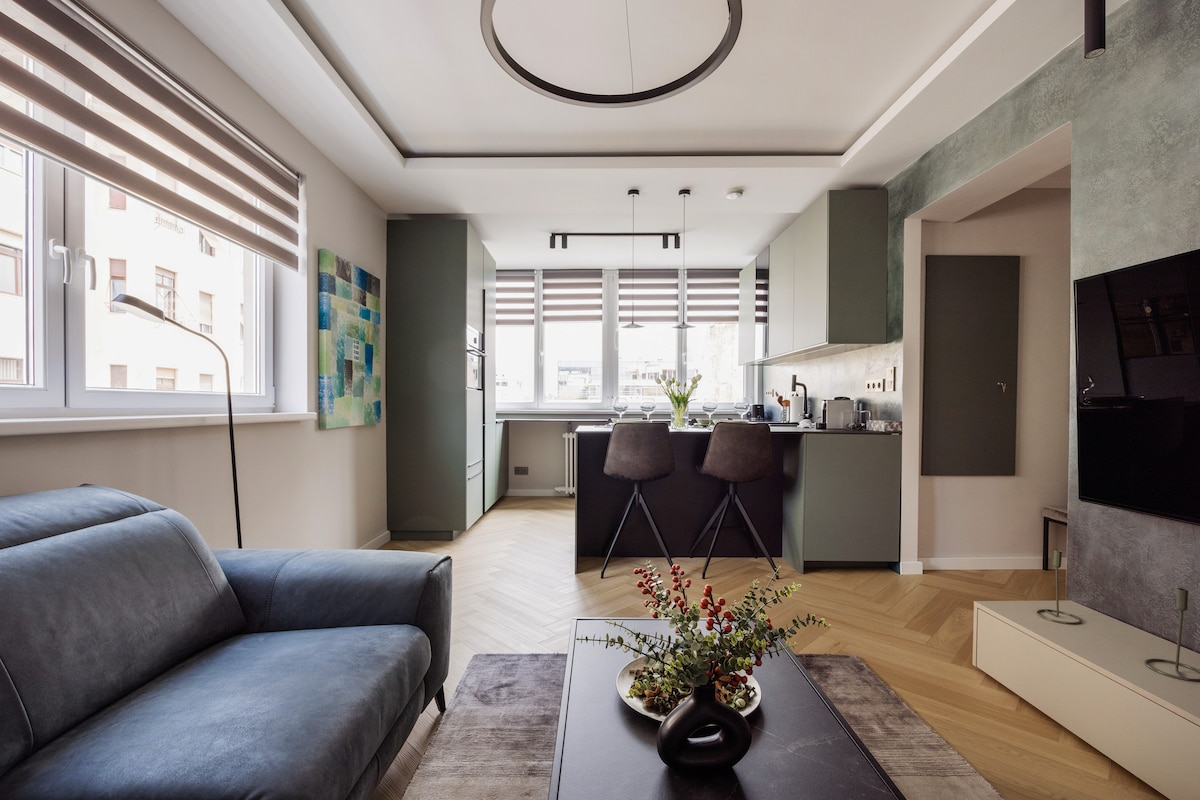 Beautiful, modern, bright and newly furnished apartment with balcony in the 13rd district close to the Danube! FREE PARKING in the garage. Lovely and peaceful location, however it has quick access to the city center (Deák square 12 min by metro/no transfer). The metro station is 150 m from the apartment! Free gifts for our guests! It can accommodate 4 people. The air-conditioned apartment has a bedroom for two (king bed - 180x200), a spacious living room with a sofa-bed for two (150x200).