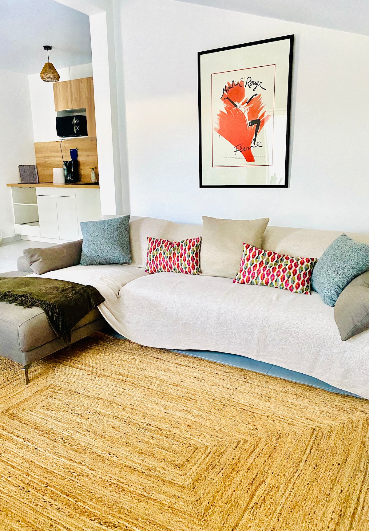 Appartement coquet, neuf , climatisé et vous détendre dans un lit king size avec TV et un grand canapé lit avec TV 65". Proche du bourg, de l'aéroport, d'un grand centre commercial à 20min. La terrasse de 15m2 pour les fumeurs avec un jacuzzi de 2 à 4 personnes et 2 parkings . La nuitée pour 4 personnes /min.1 nuit. A la semaine ou au mois, prix dégressif . Arrivée entre 13h et 21h/ départ entre 6h à 11h. L entrée et la sortie sont autonomes avec boîte à clés. Nous sommes classés 3 étoiles.