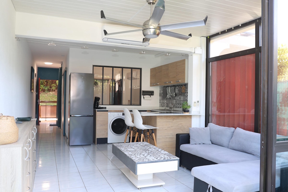 Charmant T2 au 2e étage d’une résidence moderne, idéal pour professionnels, couples ou petites familles. Calme et sans vis-à-vis, il offre une terrasse avec une table pour vos repas en extérieur, un espace bureau, un lit confortable et des équipements haut de gamme, dont une cave à vin. Alliant confort et raffinement, cet appartement est parfait pour se détendre. Situé à Cayenne, il vous garantit le calme de la périphérie tout en restant proche des commodités.