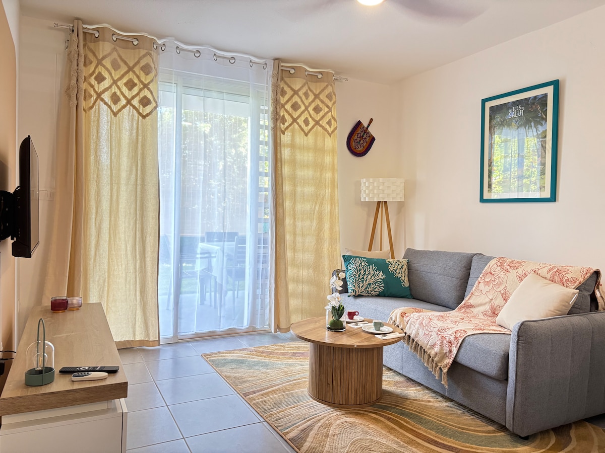 Profitez d'un logement de standing sur équipé au pied de la Coline de Bourda et a 50 metre de la plage, plage ou vienne pondre les tortues Luth . Il se situe à quelques minutes du centre-ville et des centre commerciaux, dans une résidence avec piscine, carbet, parking gratuit sécurisé et borne pour véhicules électriques