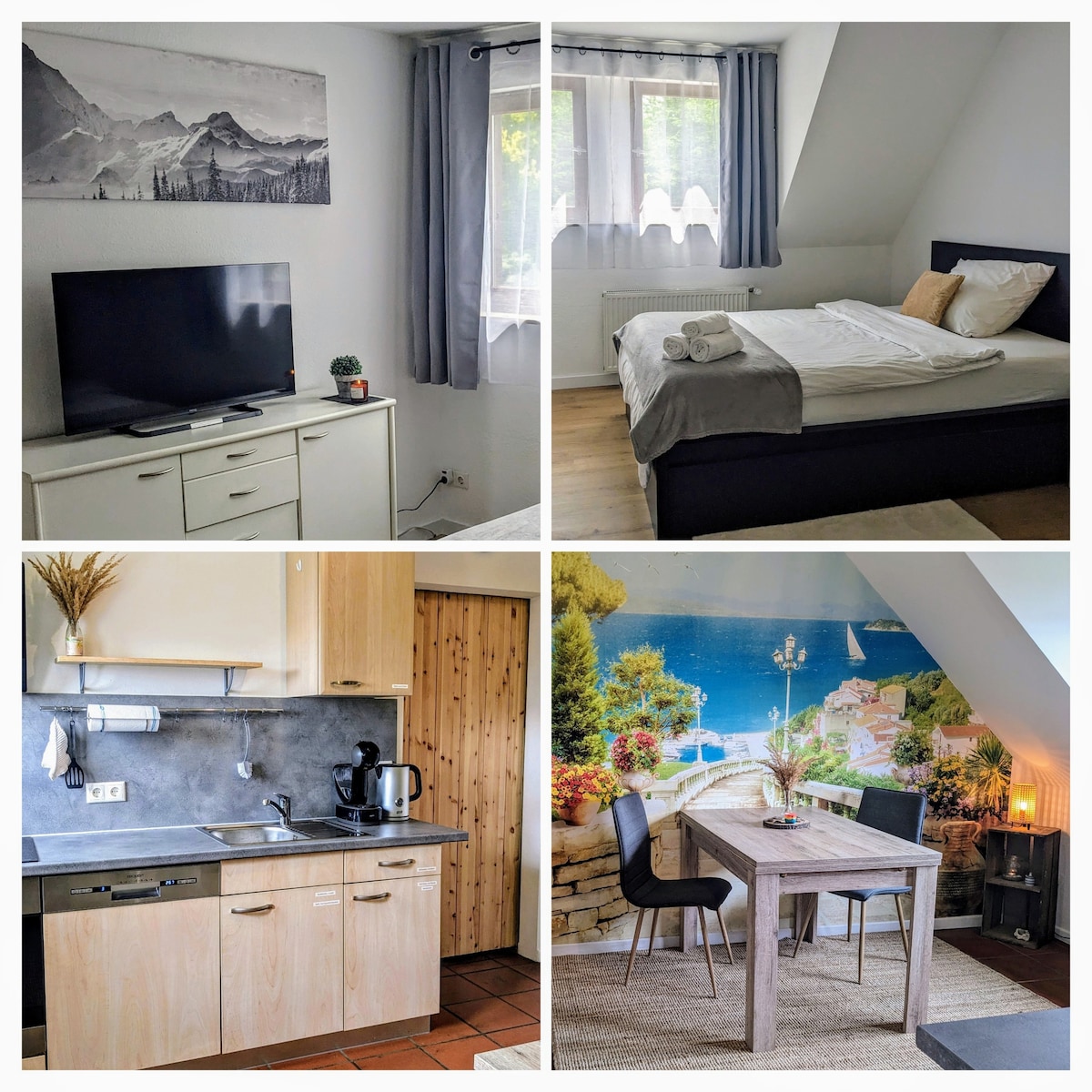 Geräumige, voll ausgestattete Ferienwohnung für 1 Person auf dem Land – mit Küche, Smart-TV, 140er Bett, Waschmaschine, Trockner und kostenlosem Parkplatz direkt vor der Tür. Genießen Sie die frische Landluft bei Spaziergängen auf Wanderwegen ab der Haustür oder entspannen Sie bei einer Tasse Kaffee mit Blick auf Wald und Wiesen.