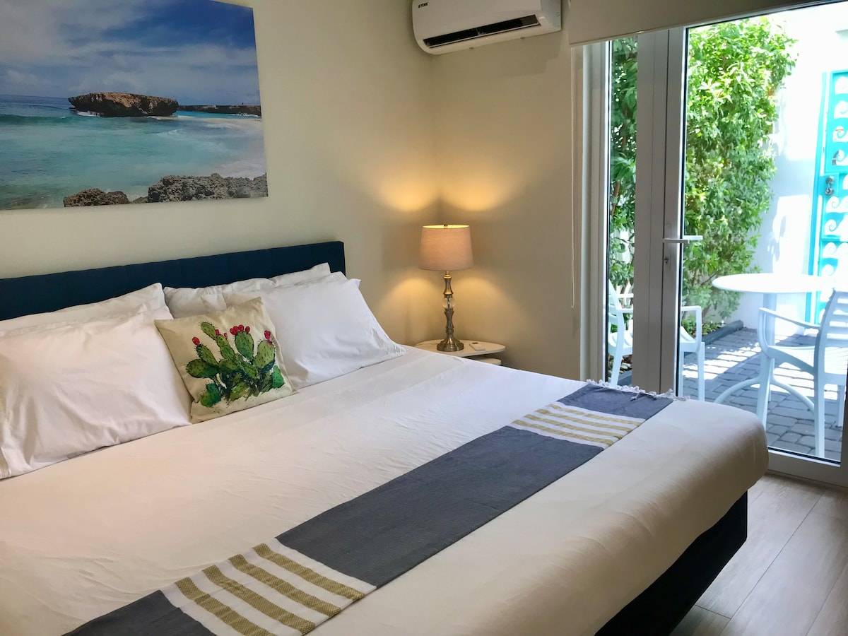 Though smaller in size, Studio 47 is huge on style & function, & has a private patio. The location allows you to immerse in the local culture, within easy walking distance of all tourist hotspots in the newly revitalized Oranjestad. Explore beaches, casino’s, the island best shopping, historical sites, museums, parkland, galleries, renowned restaurants, entertainment +++ by foot. The bus terminal is short walk .