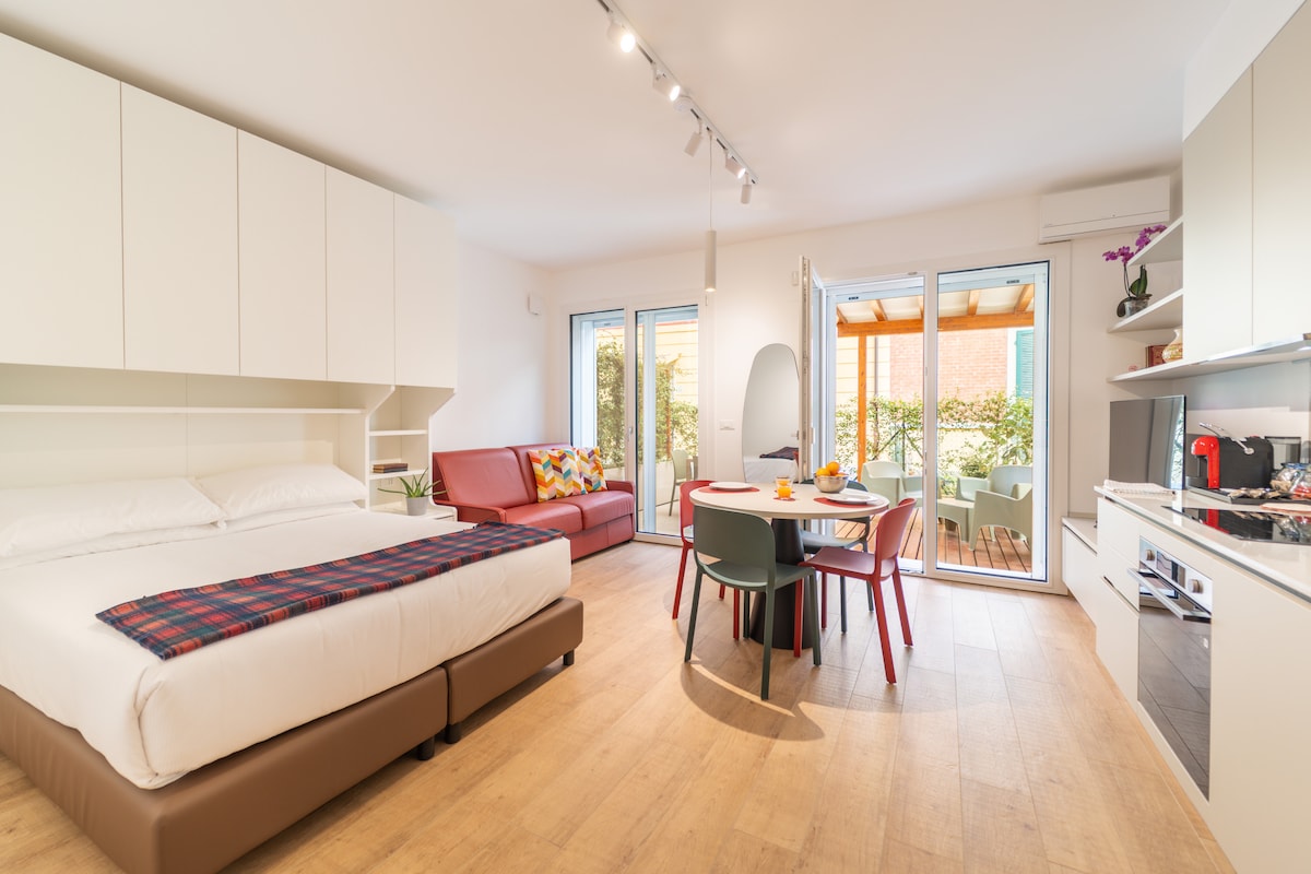 An ancient building in the center of Bologna, newly renovated in a modern and comfortable style. The loft features a queen-size bed and a French-size sofa bed. The apartment has a unique style, and we would be delighted to provide you with the best experience during your stay in Bologna.