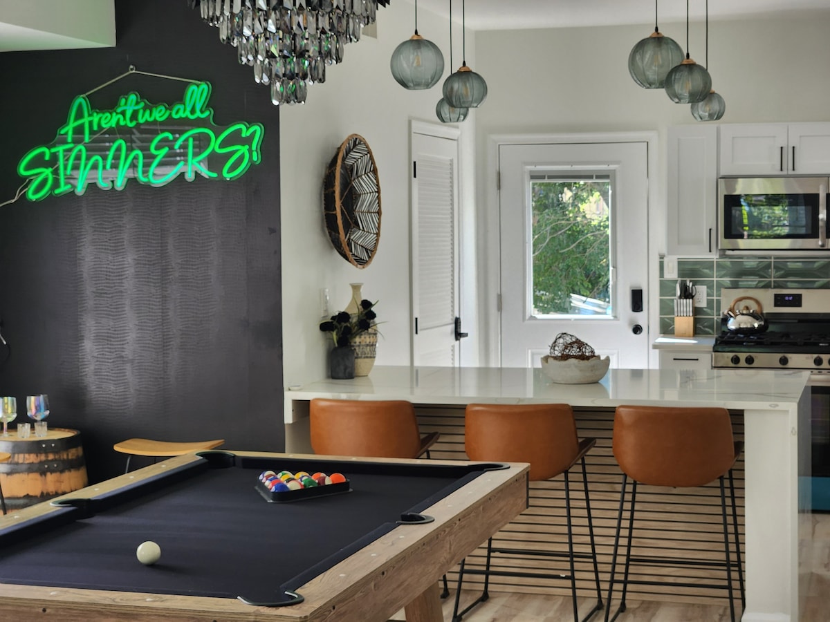 The home was created for that perfect couples getaway with it large comfy king bed on adjustable frame which looks one to barnyard doors. They open to an elegant chandelier lite soaking tub complete with the bubbles . On the his and her vanities you will find robes and towels for your use as well as other soaps and sundries ( robes are available for purchase). Of course there is also a shower and washer and dryer . Your 4 legged family are complementary but limited to 2 max 50lbs