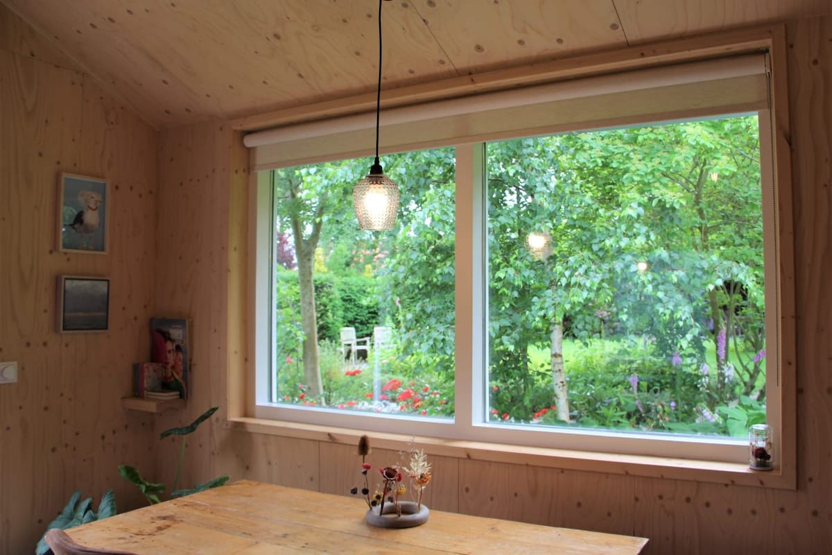 Het huisje Zilt is lekker licht en fris door de twee ramen beneden en openslaande deuren. Het huisje wordt verlicht door dimbare spotjes. De verschillende en natuurlijke materialen geven het huisje een gezellige strandsfeer en een echt vakantiegevoel. Boven is de slaapkamer heel gezellig door het steigerhouten plafond. Achter het bed is een klein raam met uitzicht op de tuin en landerijen. Dit geeft meteen bij het wakker worden al een vakantiegevoel!