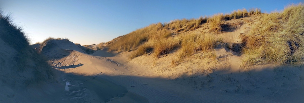 studio duinhuis ...das eigens entworfene Holzhaus mit Kaminofen liegt auf der Anhöhe gegenüber vom Badpaviljoen, 100 m entfernt vom Aufgang zum Strand! Es ist mein Lebenstraum, mit einem kleinen Atelier am Meer zu leben und Menschen in dem Gästehaus im Garten willkommen zu heißen. Das typisch Zeeländische Haus öffnet seine Fenster nach außen auf eine sonnige Holzterrasse, das Meer hört man bis hierher. Eine gemütliche Schlafempore macht das Haus besonders, die eigene Sauna ist buchbar!